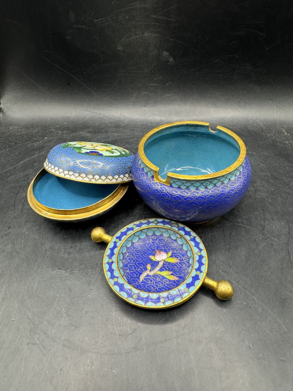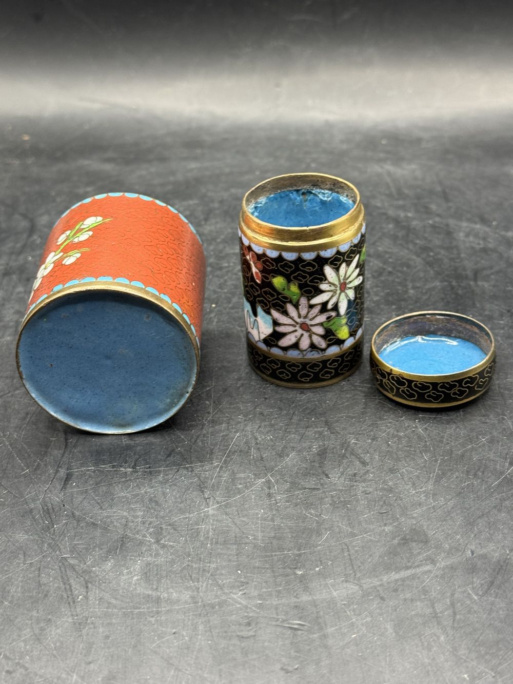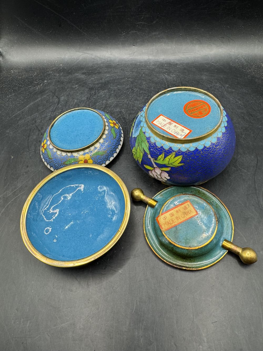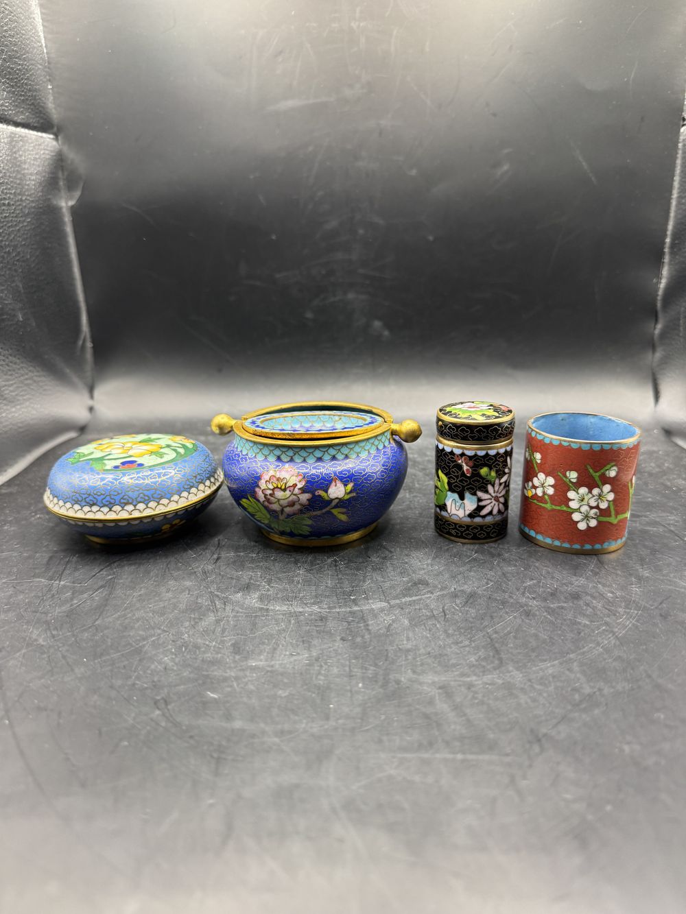 Lot/Ensemble de quatre objets chinois anciens en émail cloisonné – Pièces de vitrines – Cabinet de curiosité – Collection – Décoration