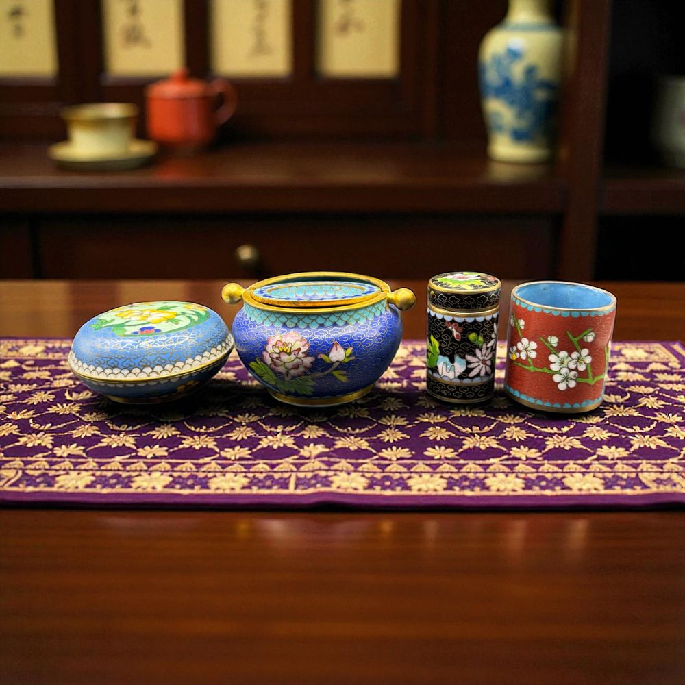Lot/Ensemble de quatre objets chinois anciens en émail cloisonné – Pièces de vitrines – Cabinet de curiosité: