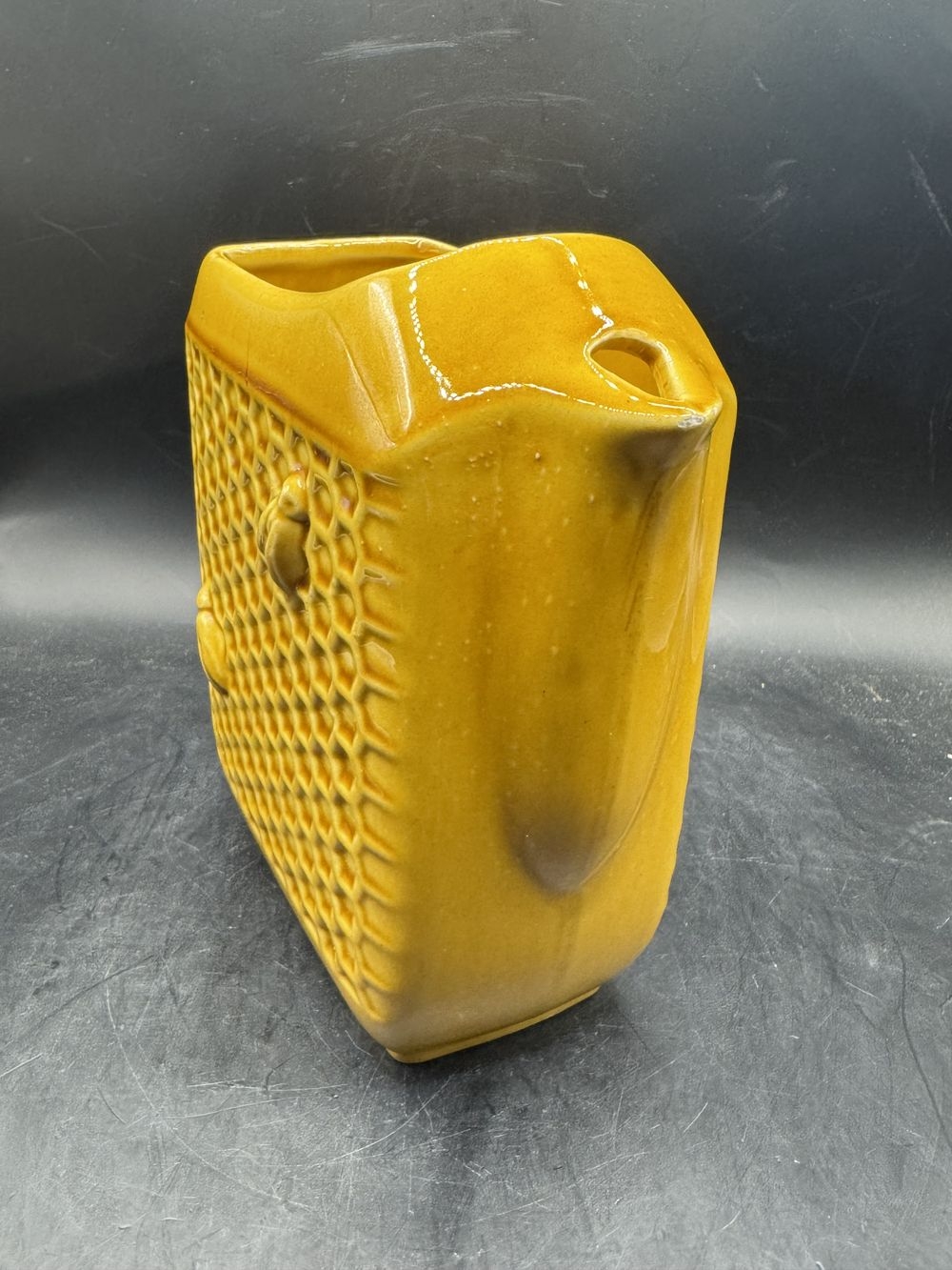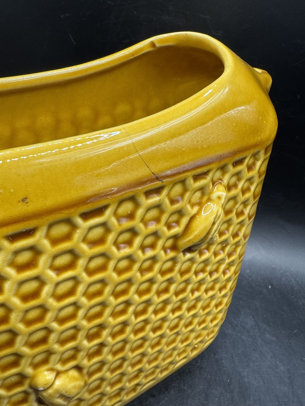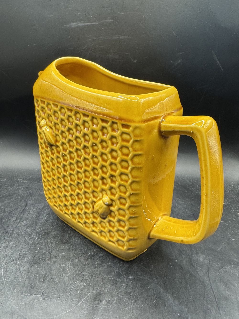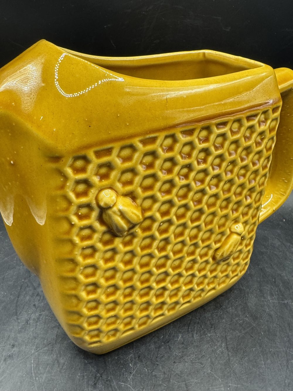 On aime: Cette superbe pièce vintage qui se distingue par son élégante couleur (joli jaune un peu moutarde), ses courbes graphiques et design mais surtout par ses motifs : un quadrillage en forme d’alvéoles ainsi que 4 petites abeilles en relief. Un objet riche de détails, qualitatif et raffiné fabriqué en France.