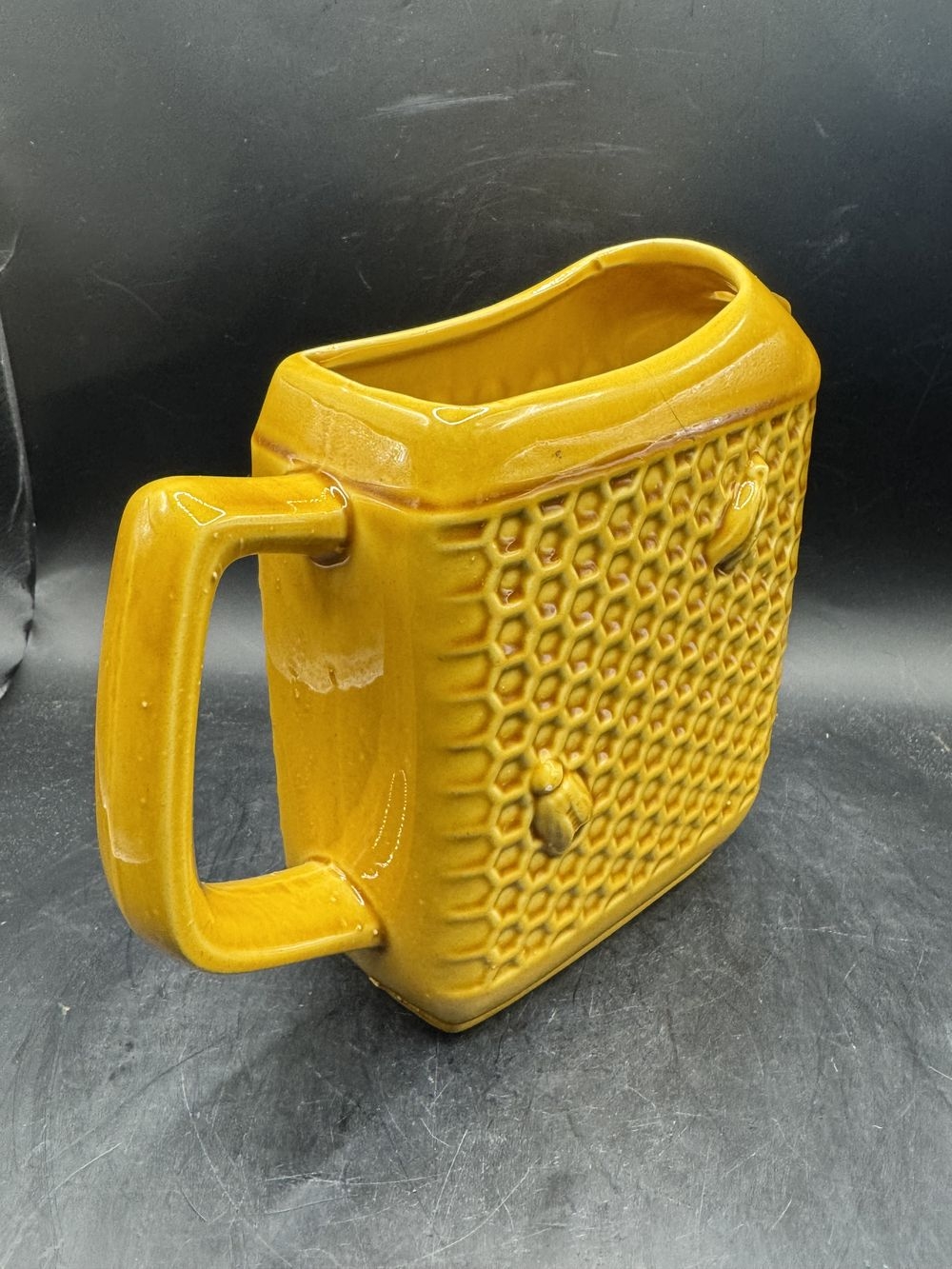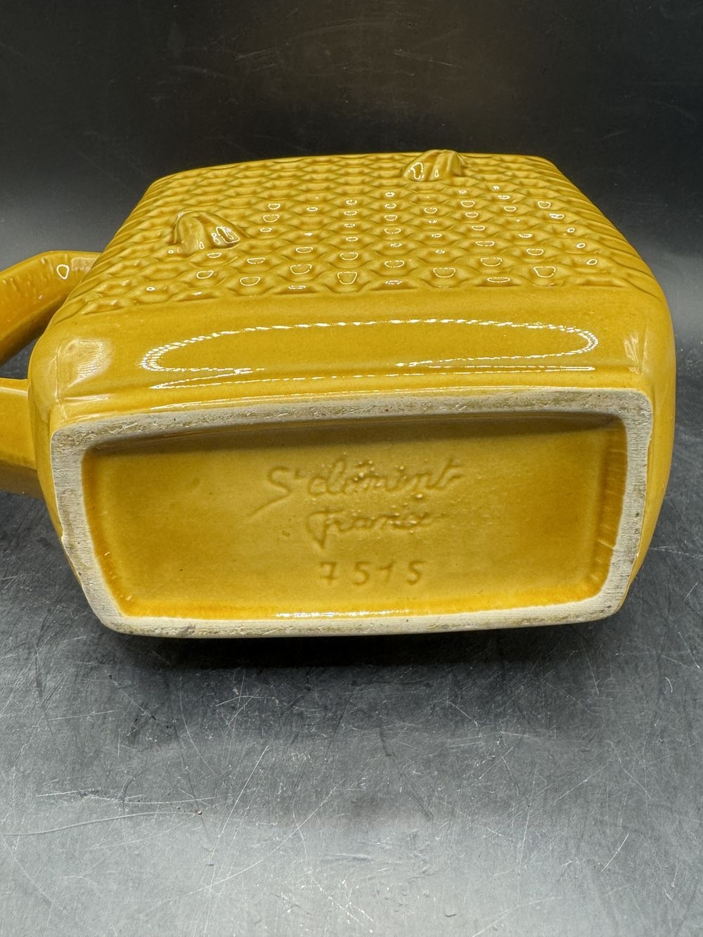 Magnifique Carafe/Pichet ancien signée Faïencerie de Saint Clément – Jaune un peu moutarde avec des décors abeilles et alvéoles