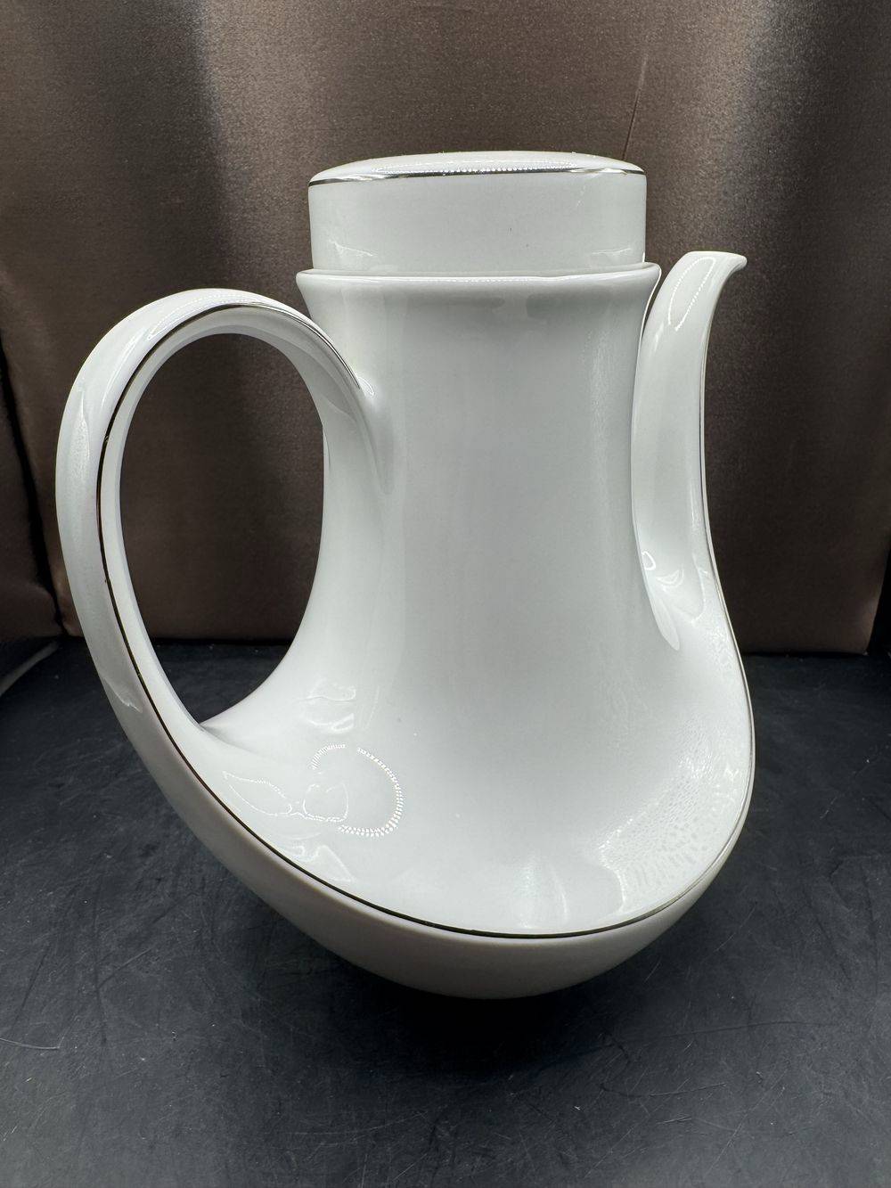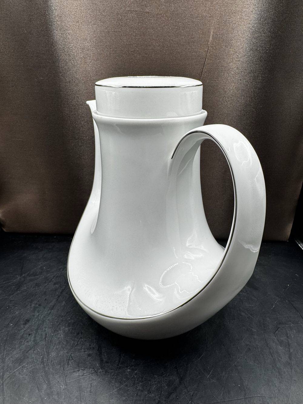 Magnifique et ancienne Cafetière et son bouchon en porcelaine de Bavière Seltmann Weiden – Vintage des années 1960 – Blanc et argentée – Collection – Déco