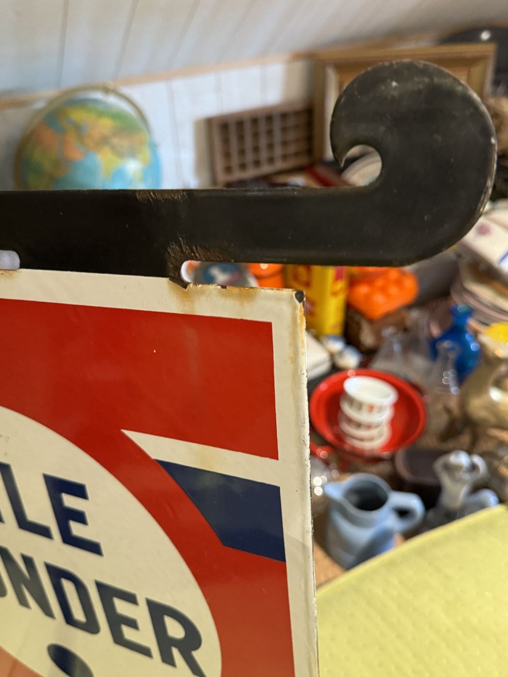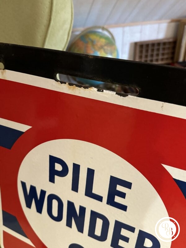 Magnifique et grande Enseigne/Plaque en tôle Emaillée – Pile Wonder – En vente ici – Double face et à équerre murale – Vers 1950 – Décoration