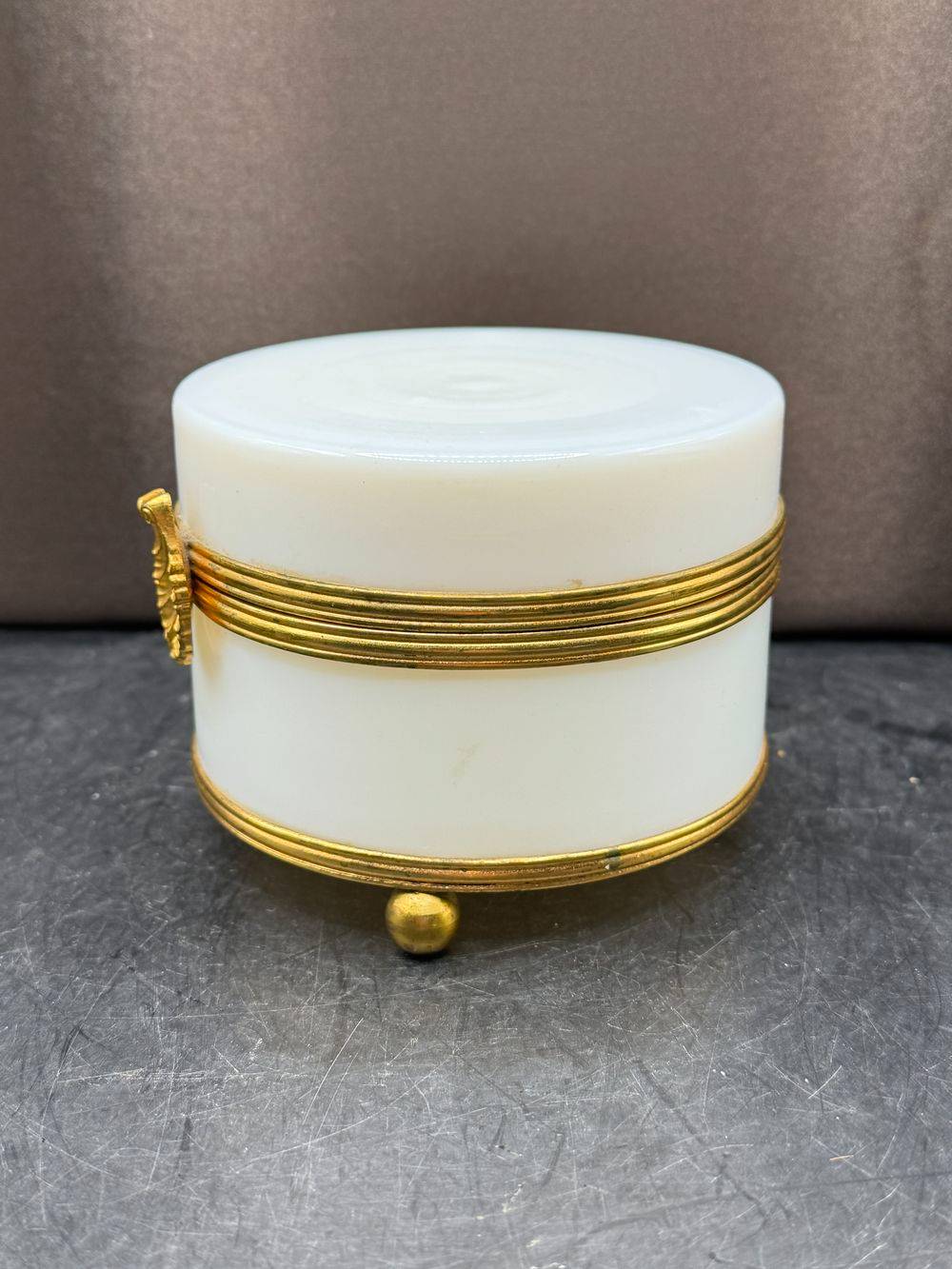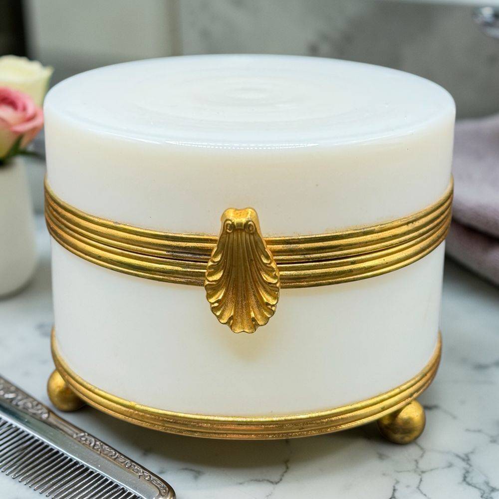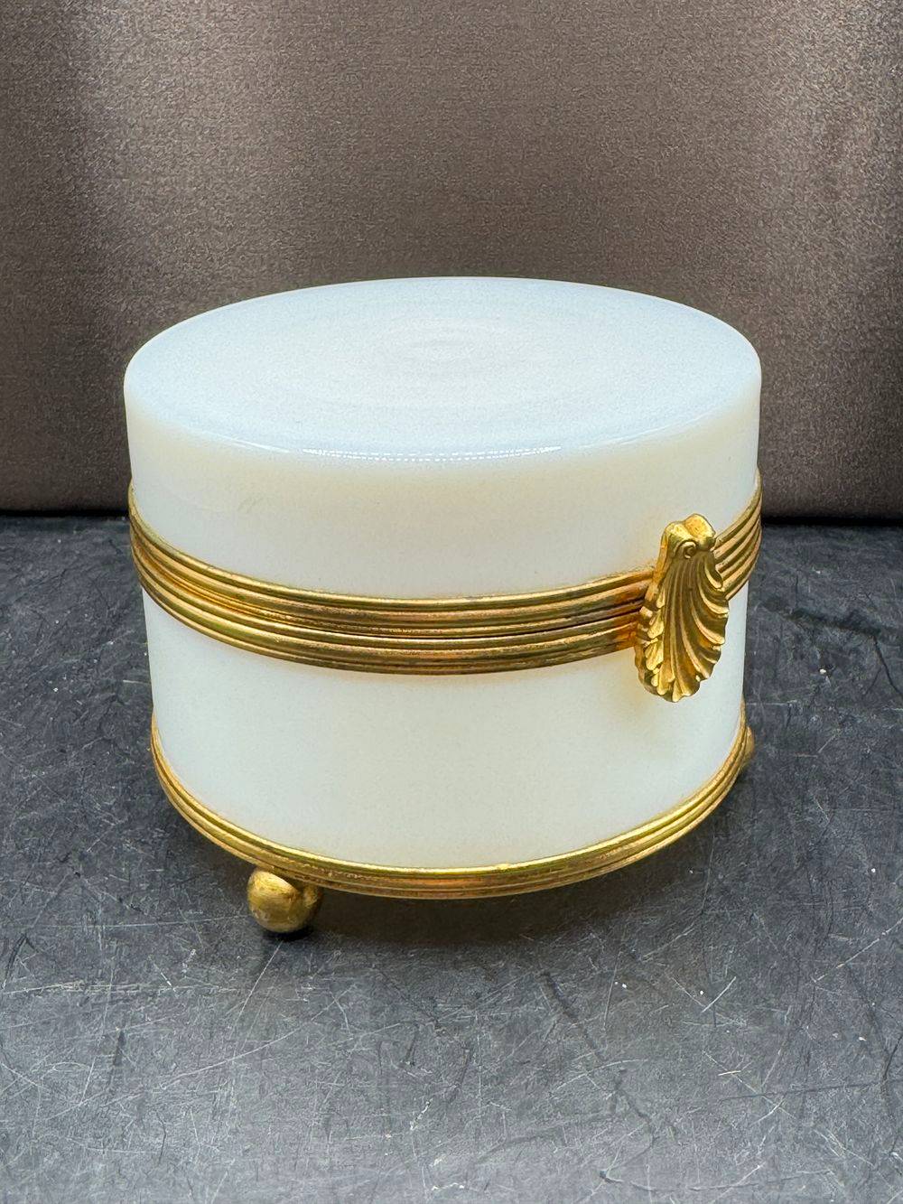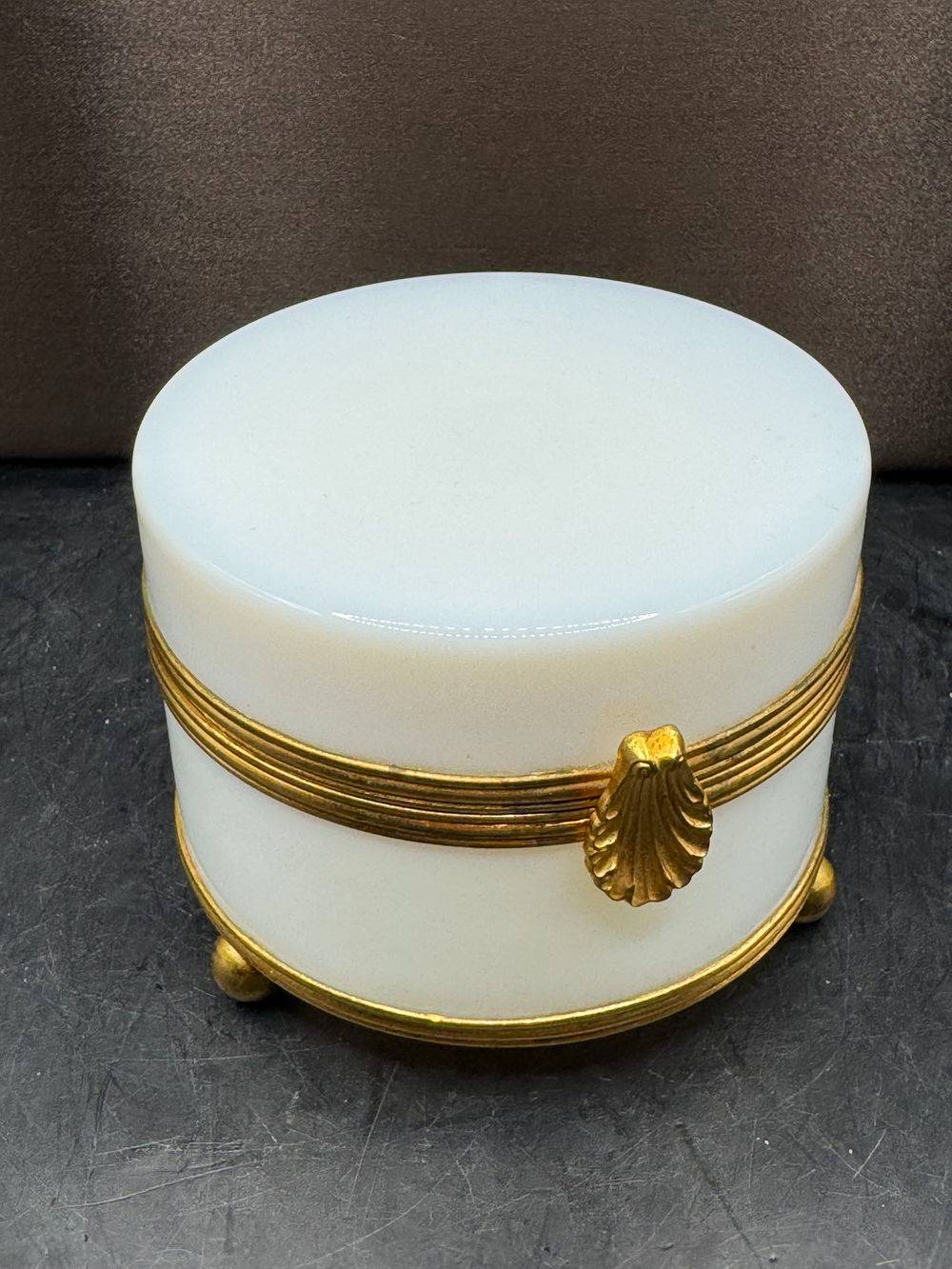 Magnifique et imposante boîte ronde en Opaline blanche légèrement translucide – Epoque milieu 19ème – Monture en laiton doré et fermoir en forme de coquille – Sur trois pieds boules – Collection – Décoration