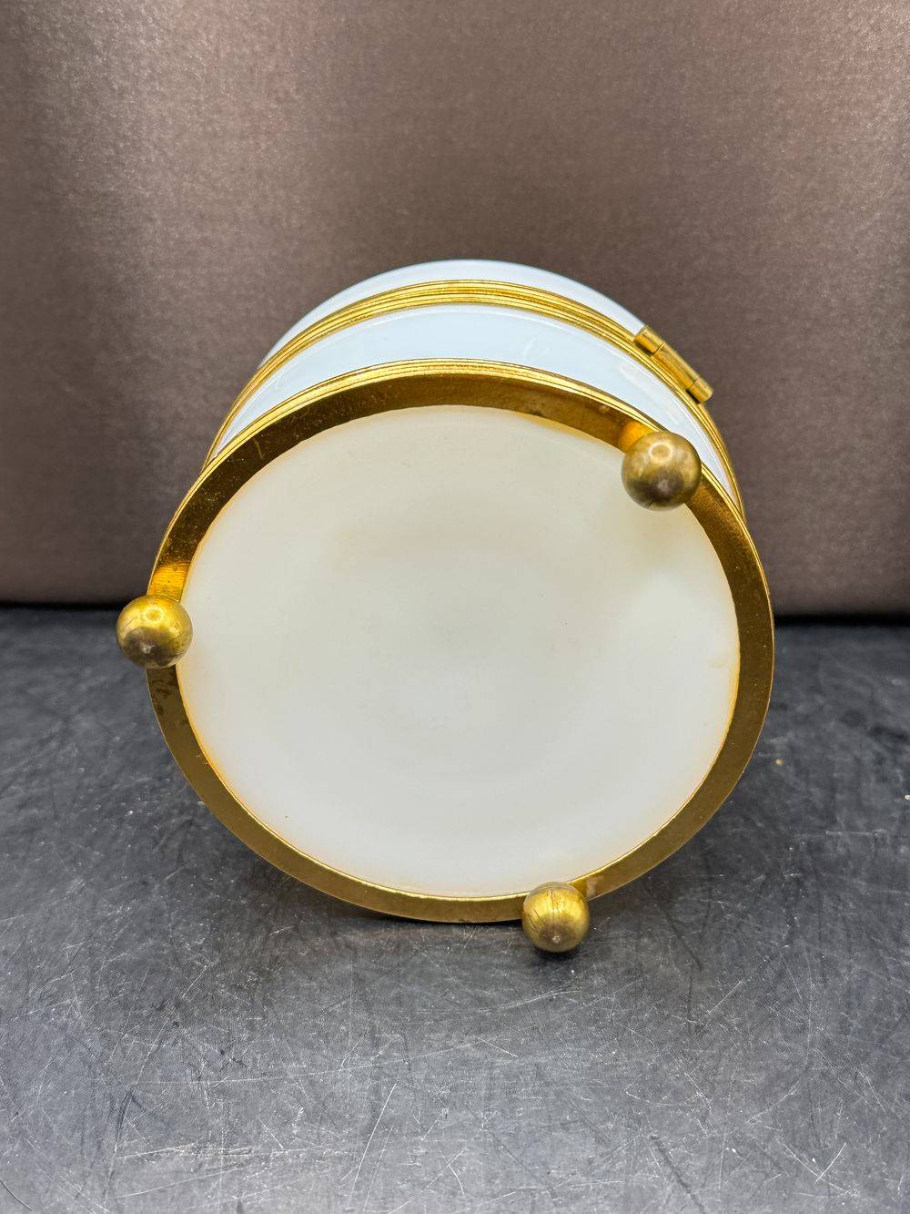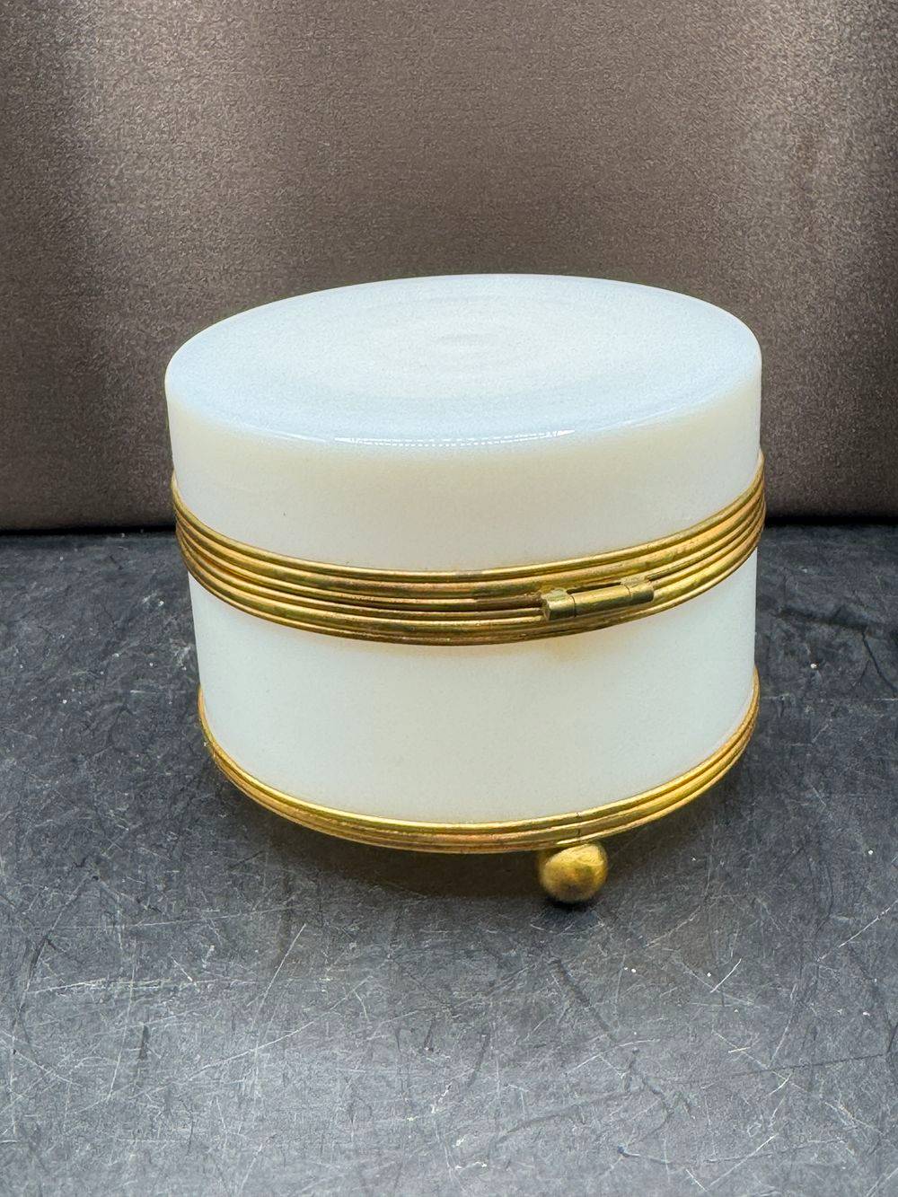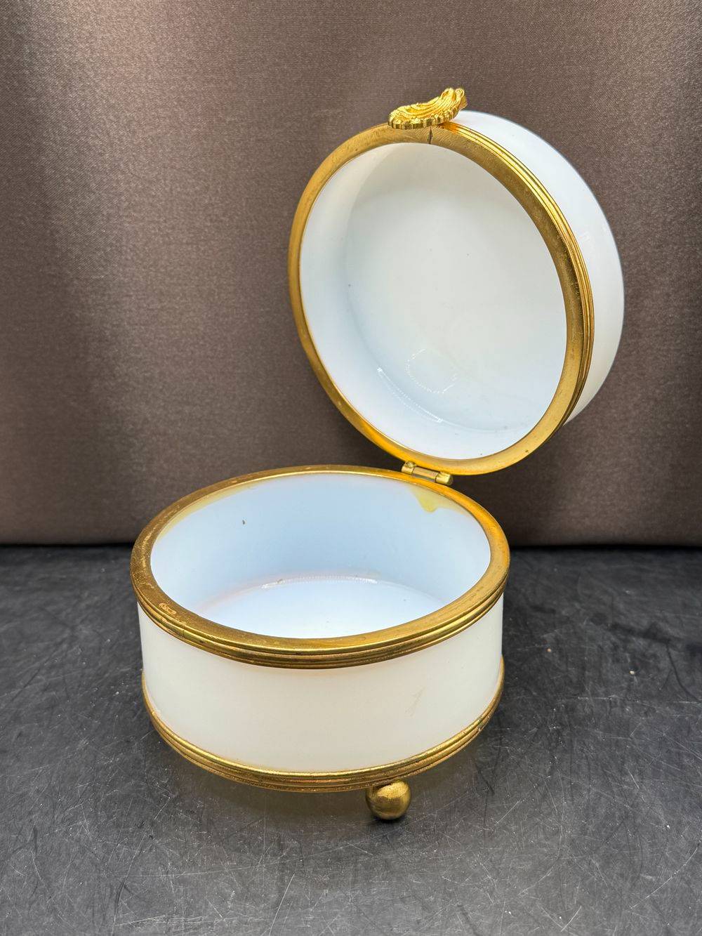 Magnifique et imposante boîte ronde en Opaline blanche légèrement translucide – Epoque milieu 19ème – Monture en laiton doré et fermoir en forme de coquille – Sur trois pieds boules – Collection – Décoration