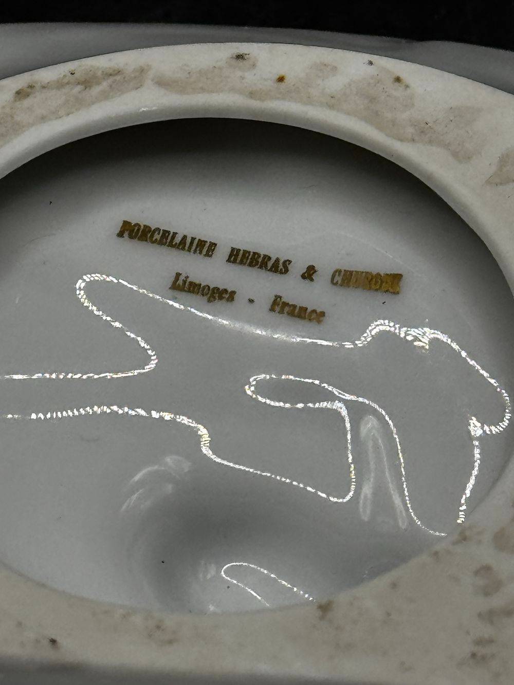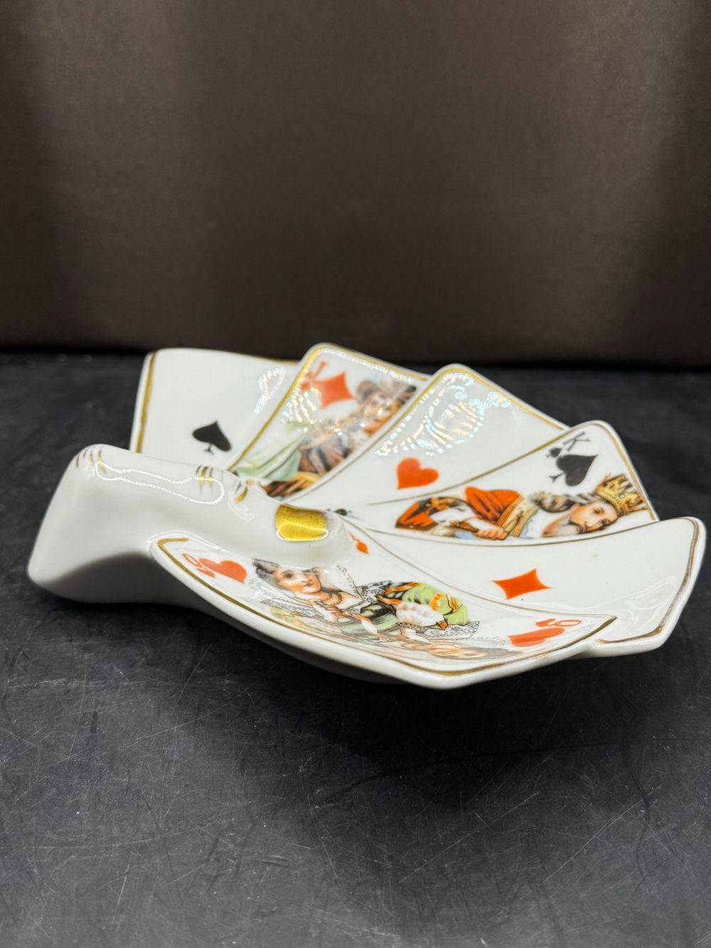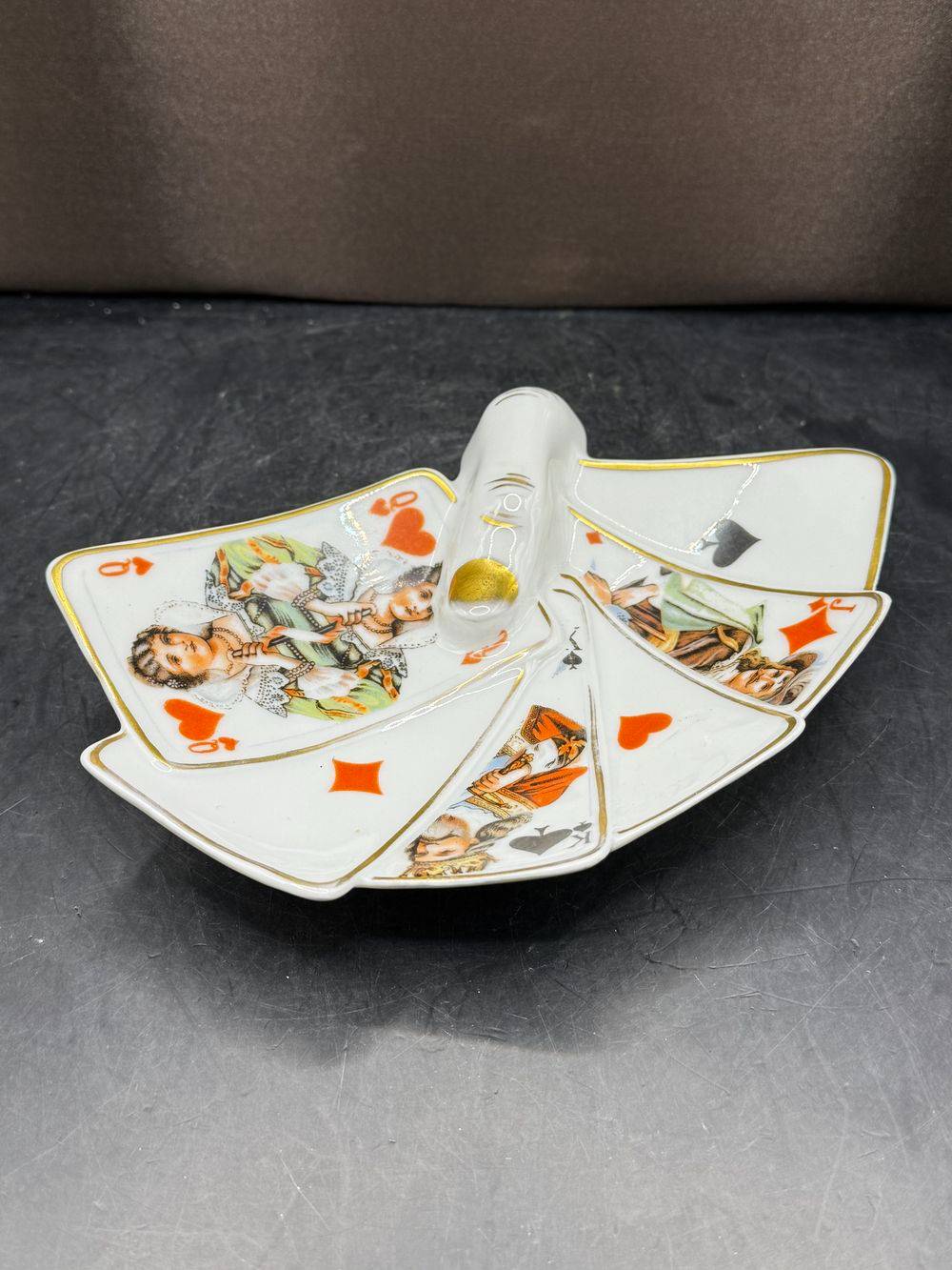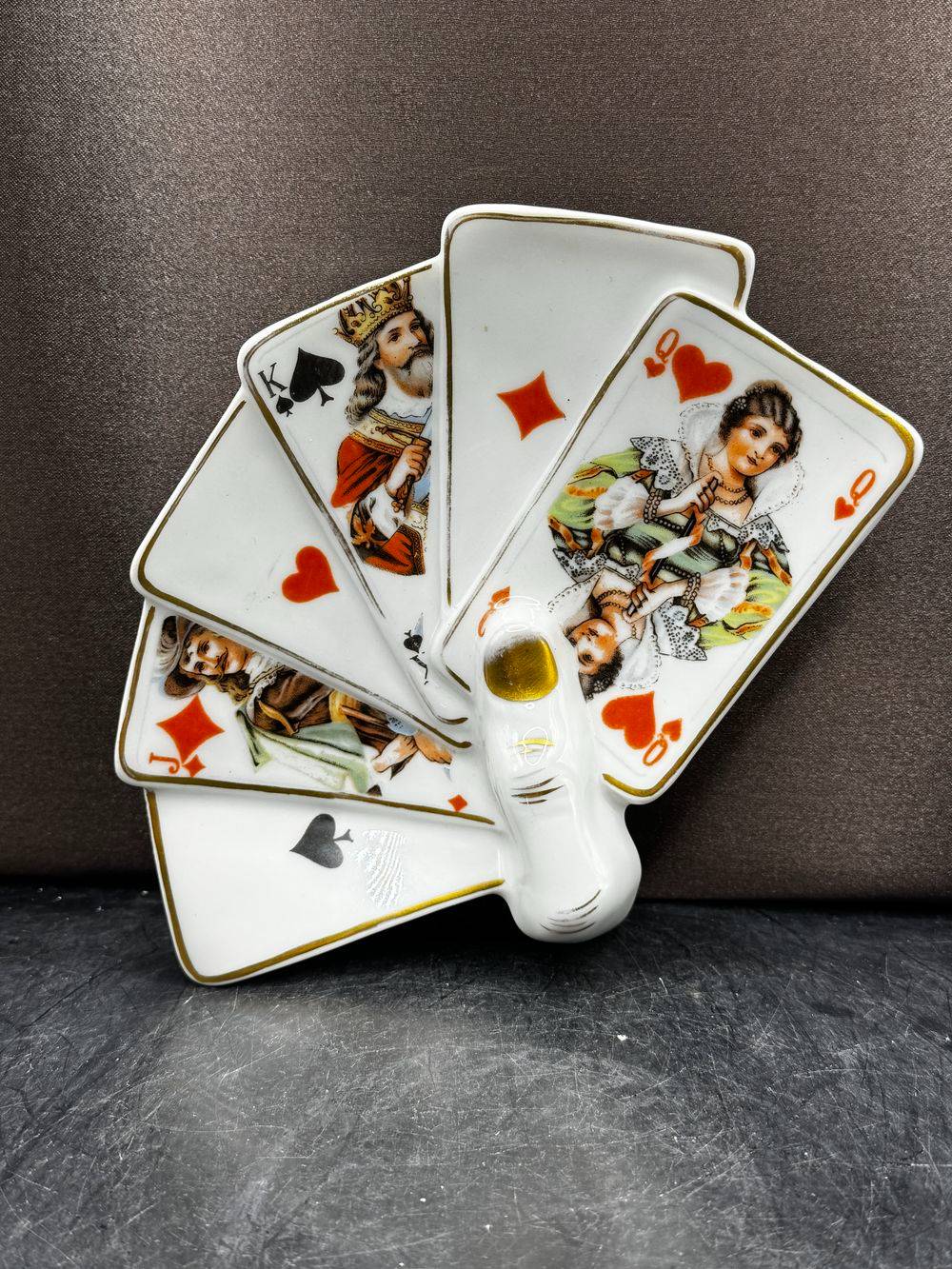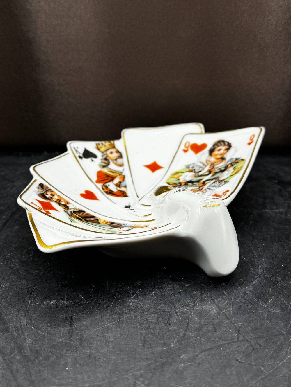 Magnifique et rare cendrier / Vide poche en porcelaine de Limoges en forme de cartes à jouer dans une main – Maison Hebars et Churoux – France – Poker, Gin Rami, Bridge – Collection – Décoration