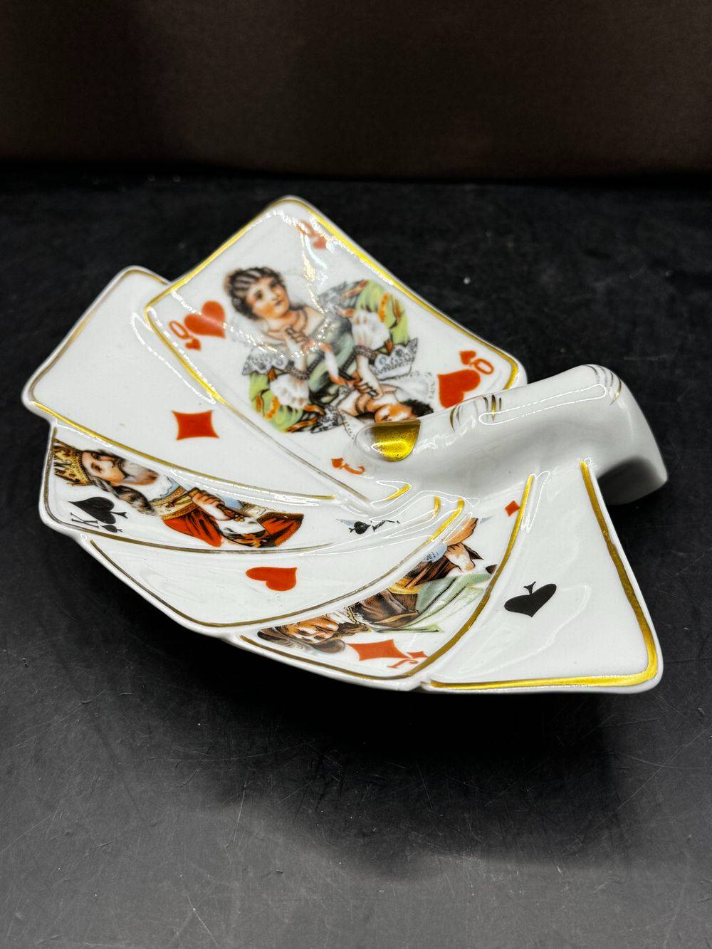 Magnifique et rare cendrier / Vide poche en porcelaine de Limoges en forme de cartes à jouer dans une main