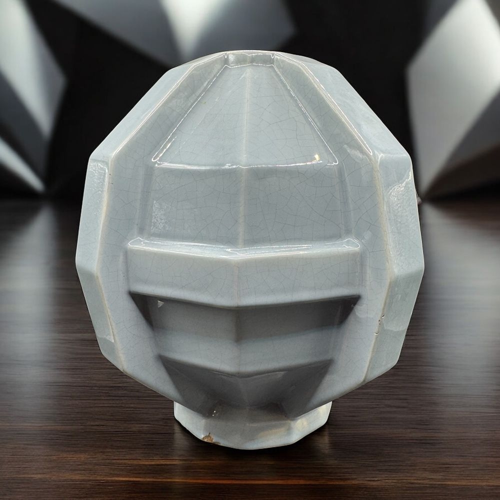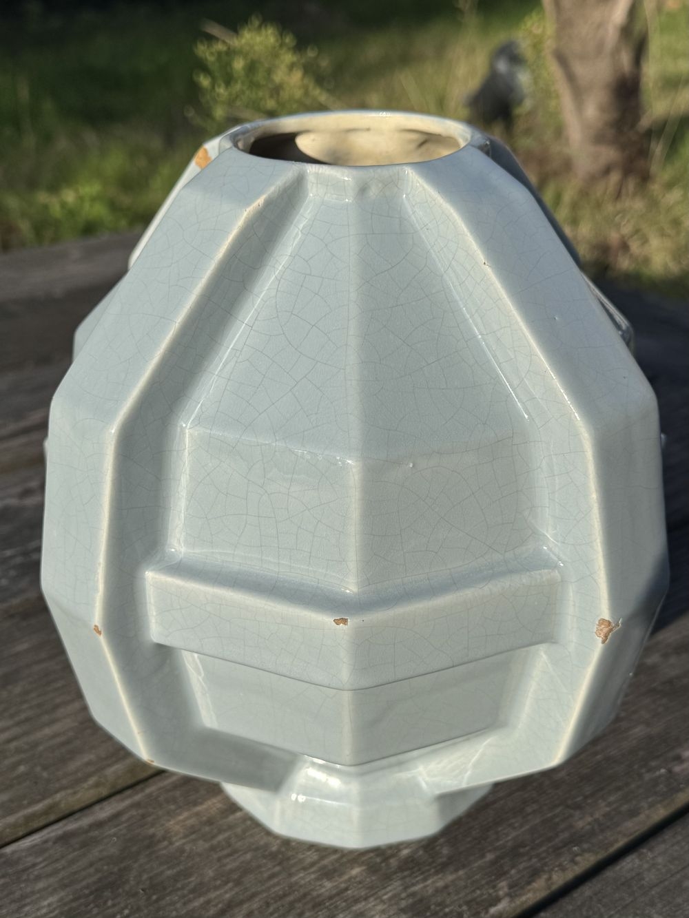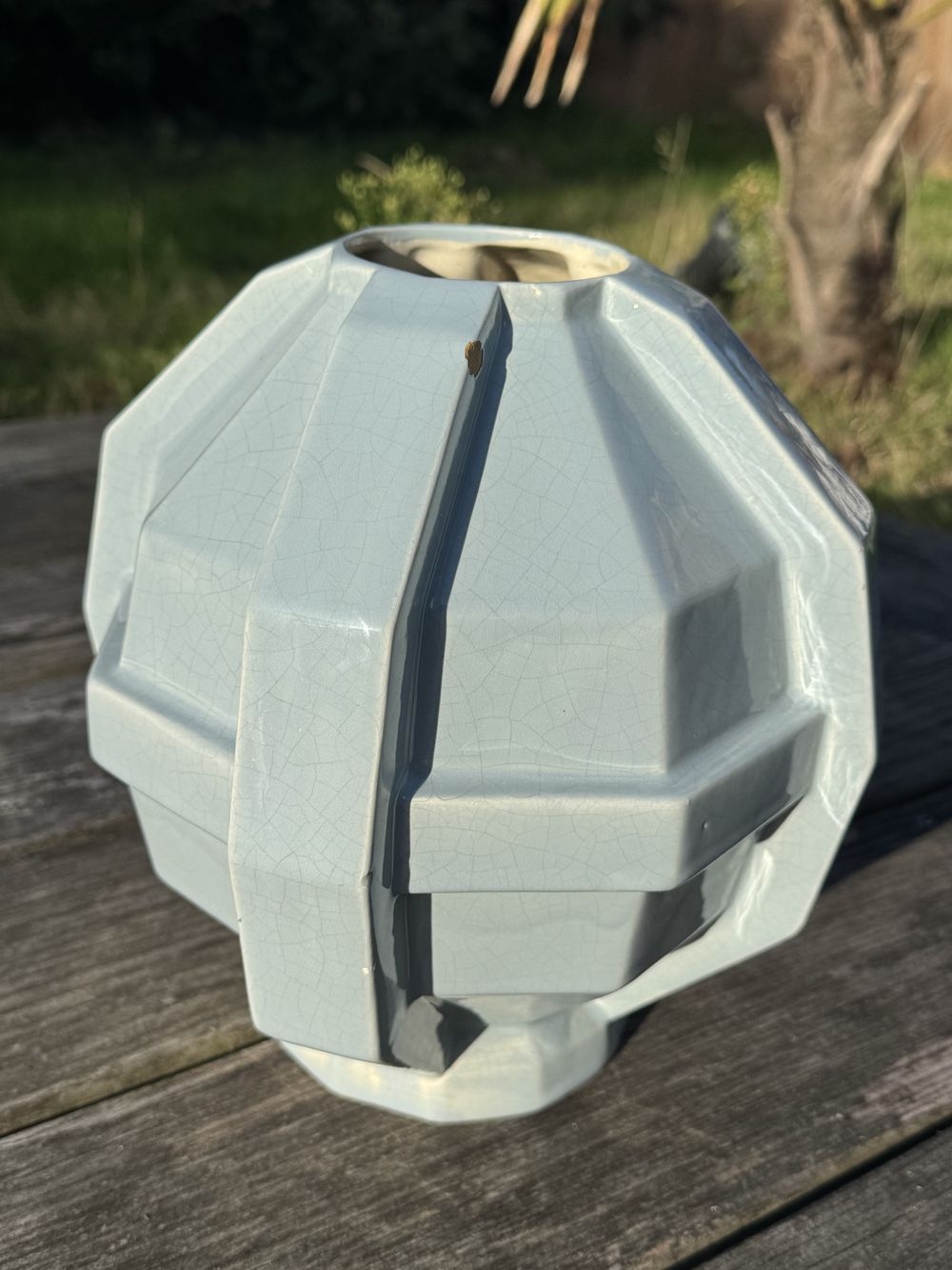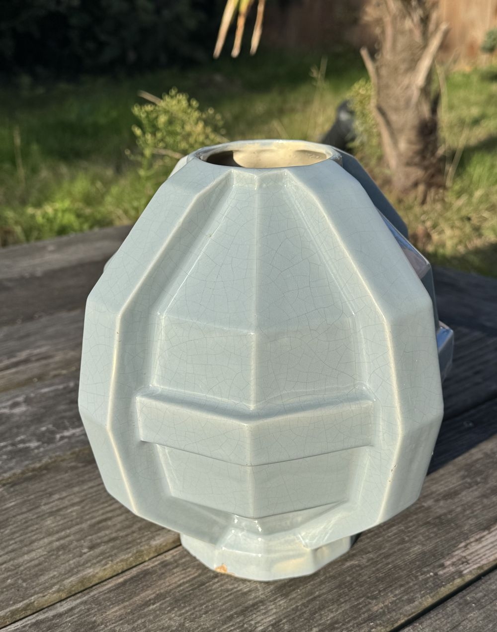Magnifique et rare vase boule au décor géométrique à facettes et bandes saillantes – Bleu gris – Production Art Déco des années 1920 à 1930 par la manufacture de Saint Clément – Collection – Décoration