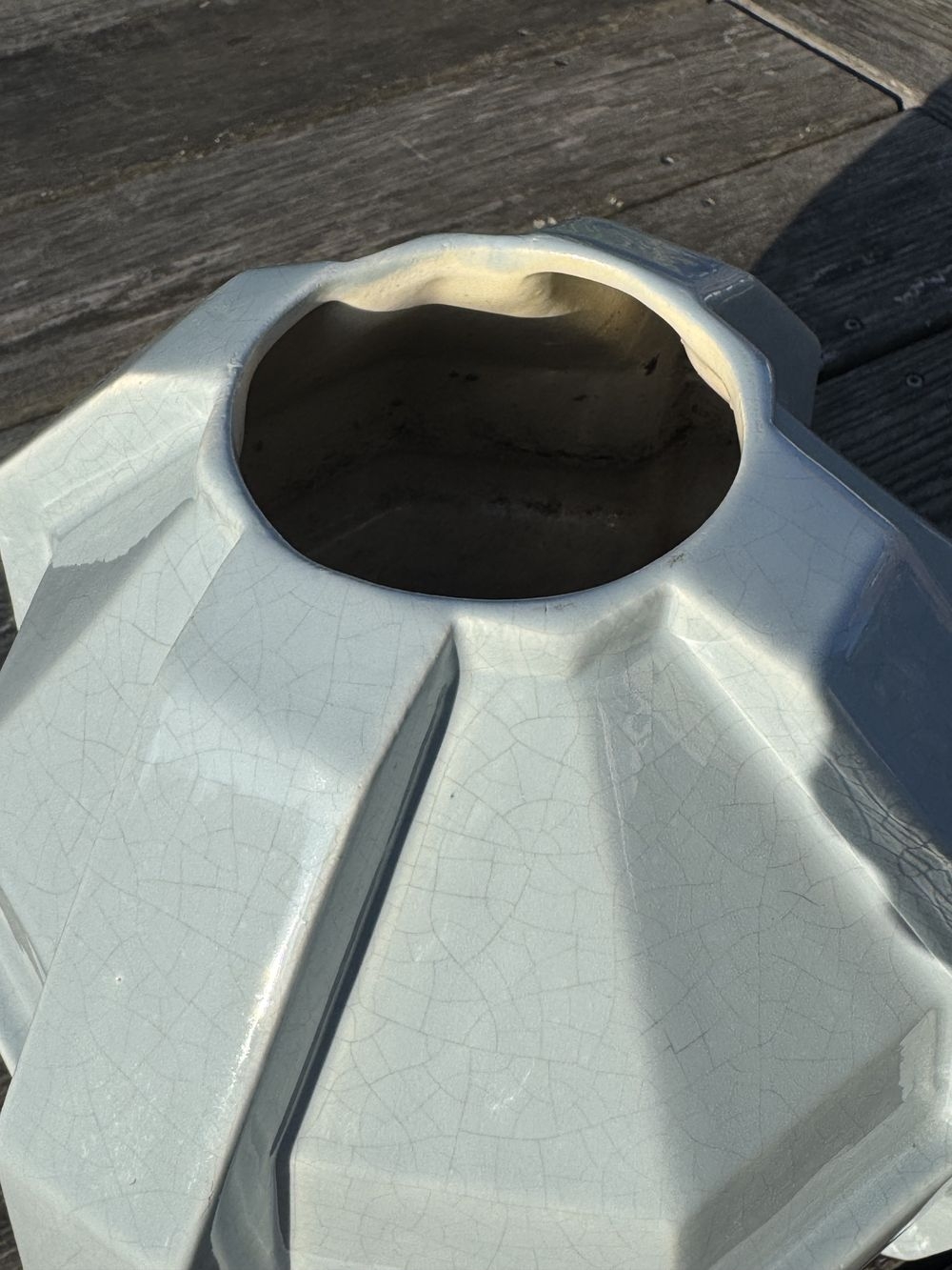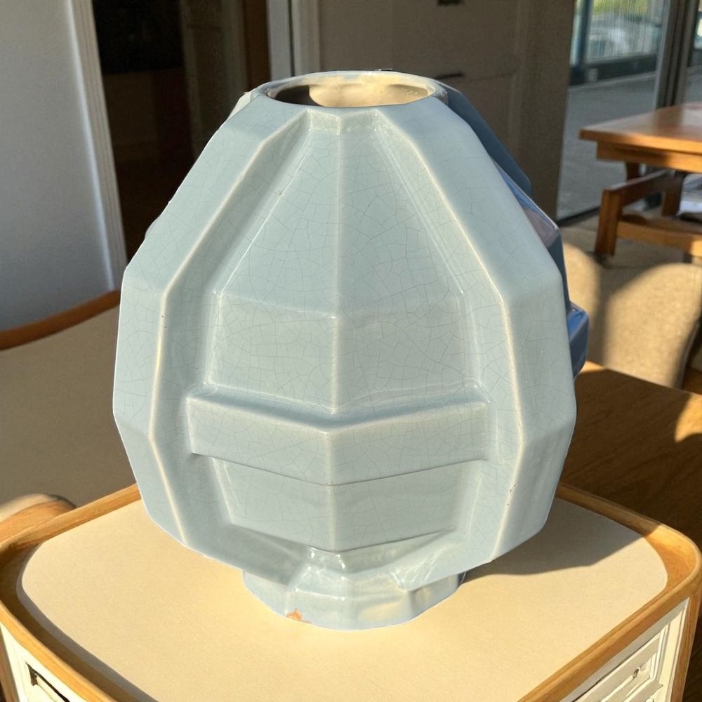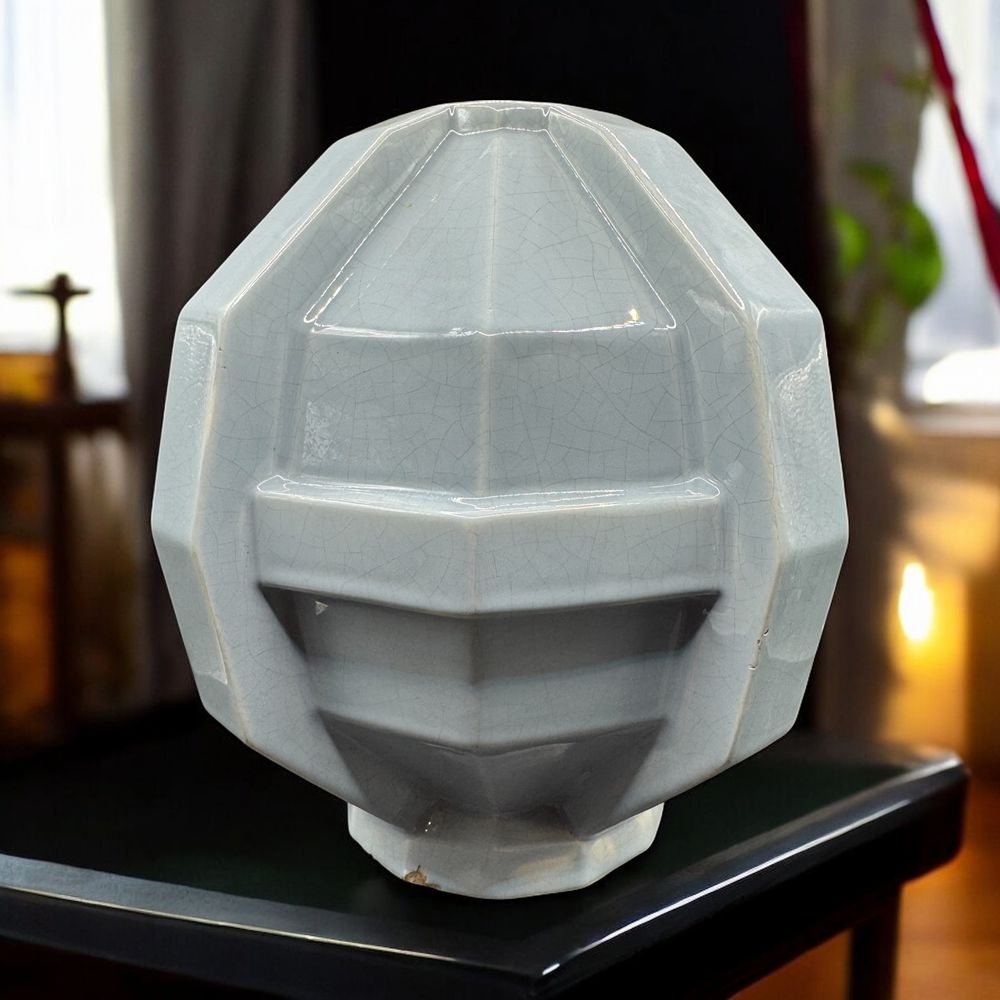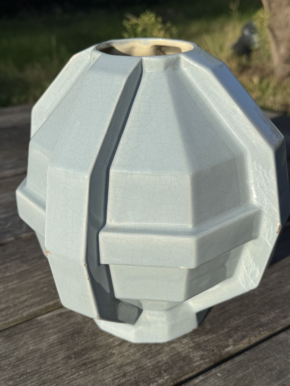 Magnifique et rare vase boule au décor géométrique à facettes et bandes saillantes – Bleu gris – Production Art Déco des années 1920 à 1930 par la manufacture de Saint Clément – Collection – Décoration