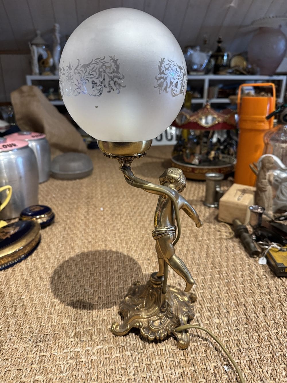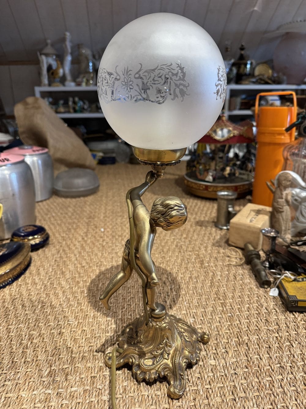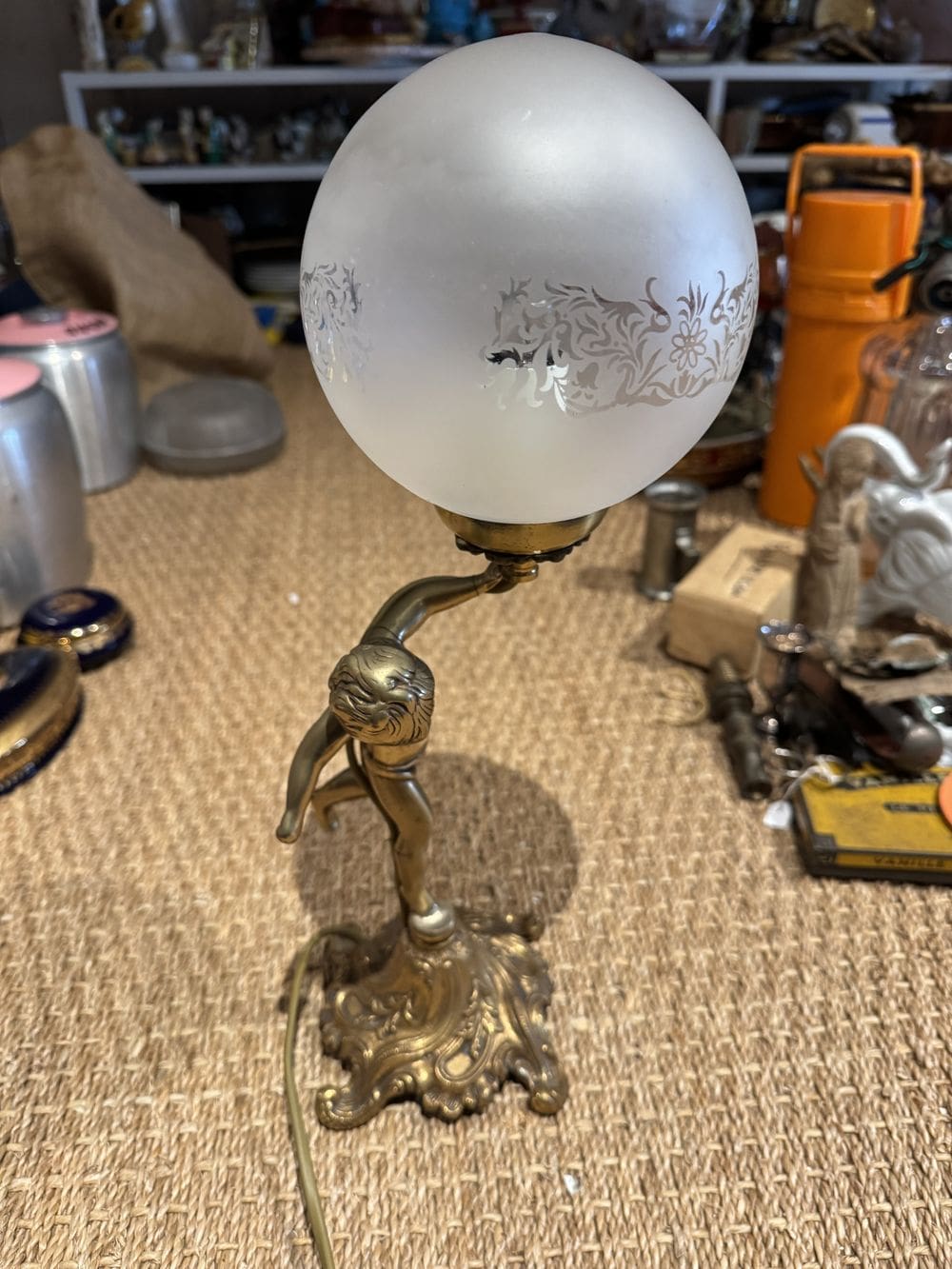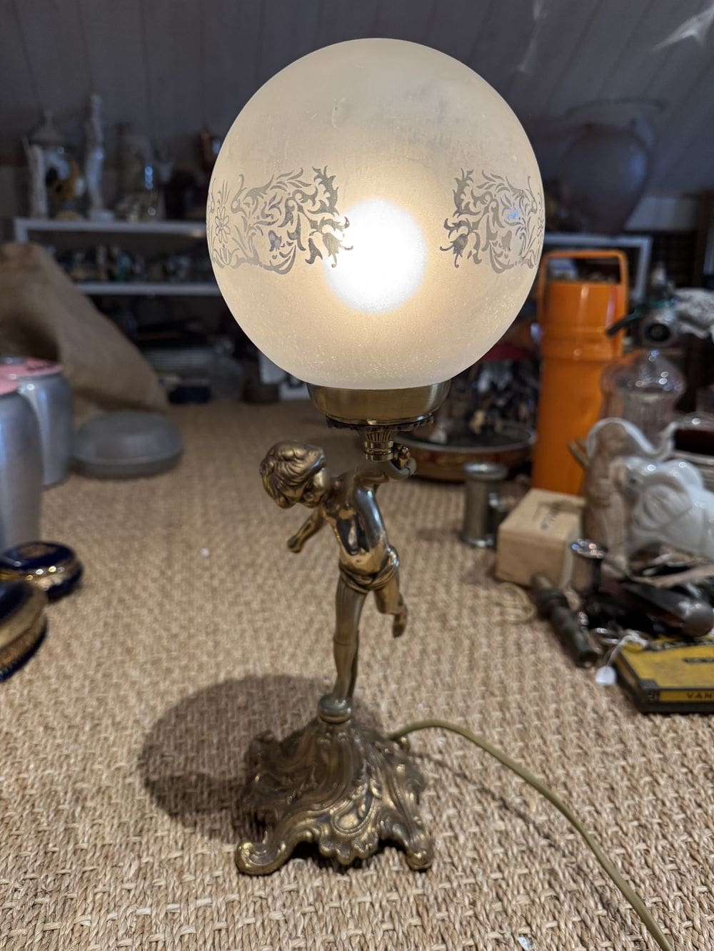 Magnifique Lampe de chevet en bronze doré et son Angelot avec son globe en verre gravé