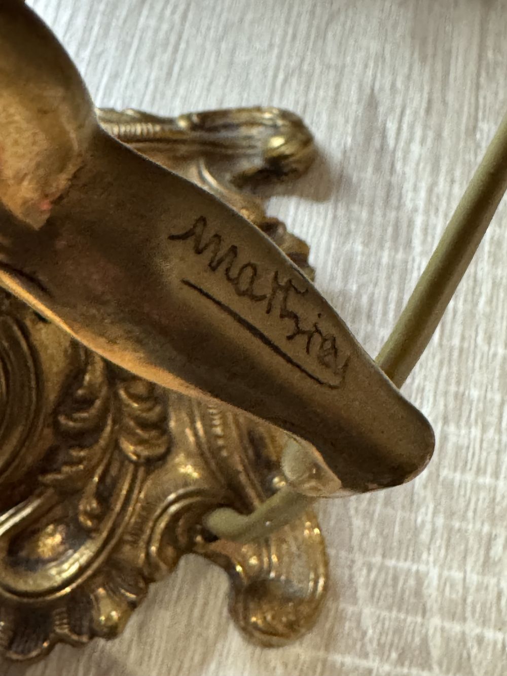 Magnifique Lampe de chevet en bronze doré et son Angelot avec son globe en verre gravé – Pièce signée Mathieu – Hauteur 38 cm – Décoration – Collection
