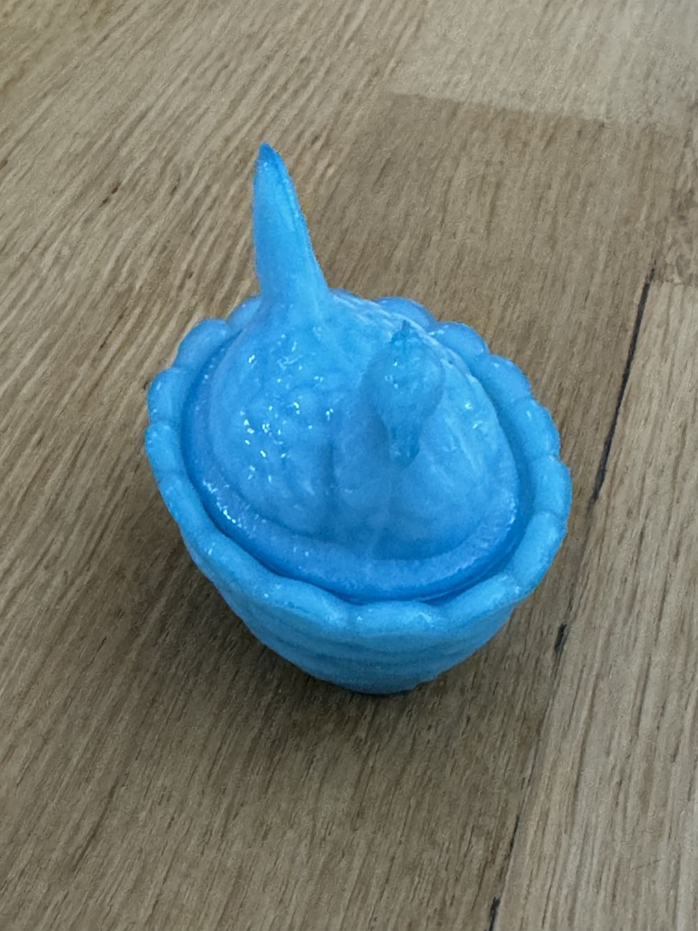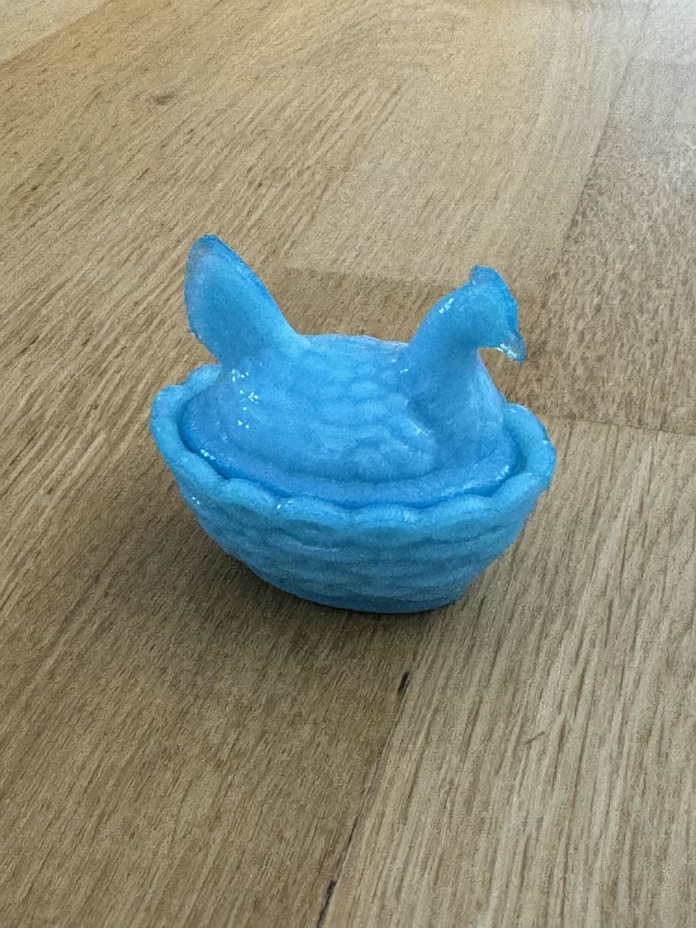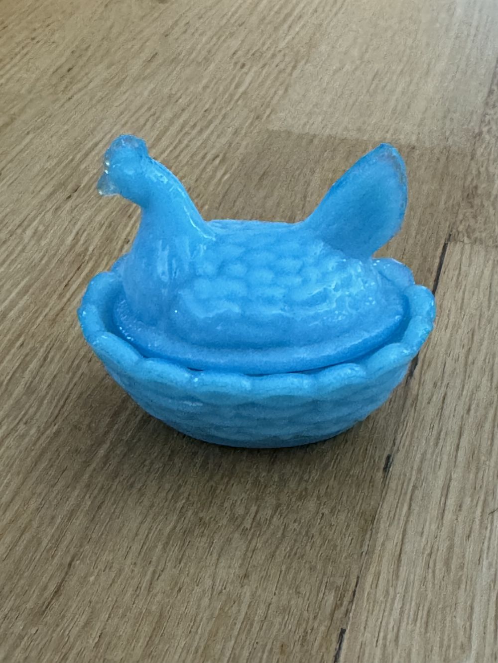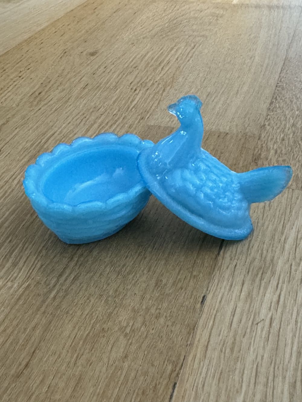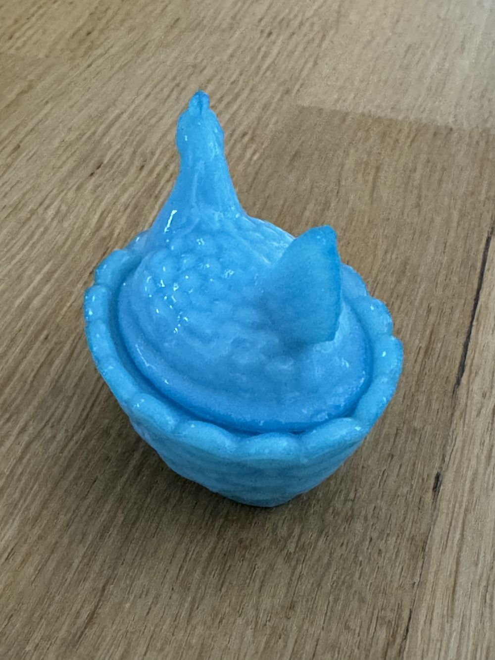 Mini bonbonnière ovale (ou sucrier ou beurrier) en verre opalescent opaline Porthieux représentant une poule sur son nid d’osier tressé. Jolie couleur bleue turquoise – Décoration – Collection
