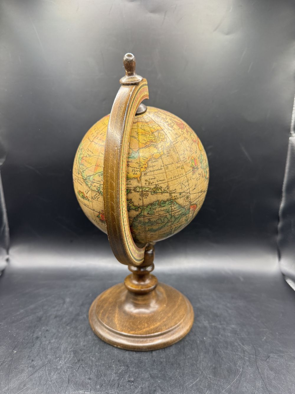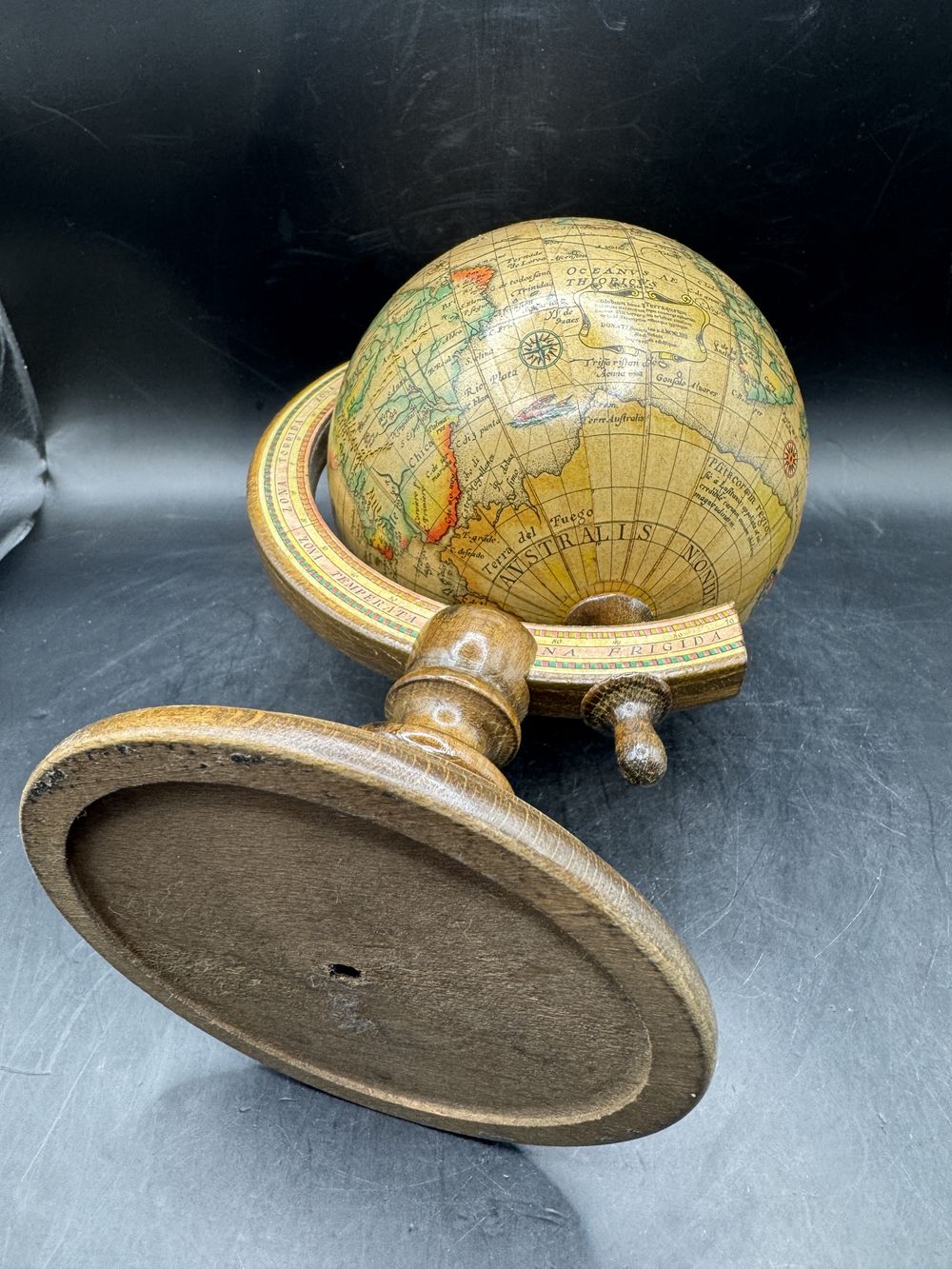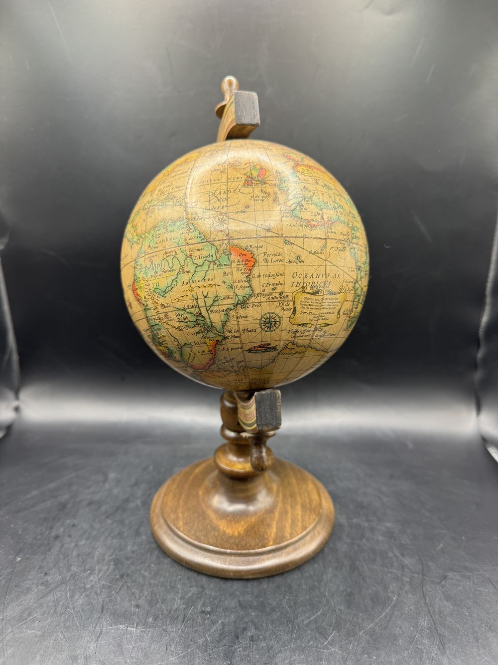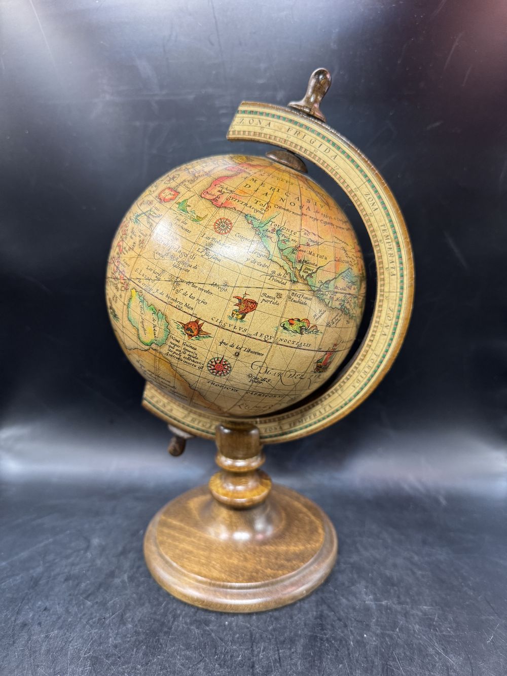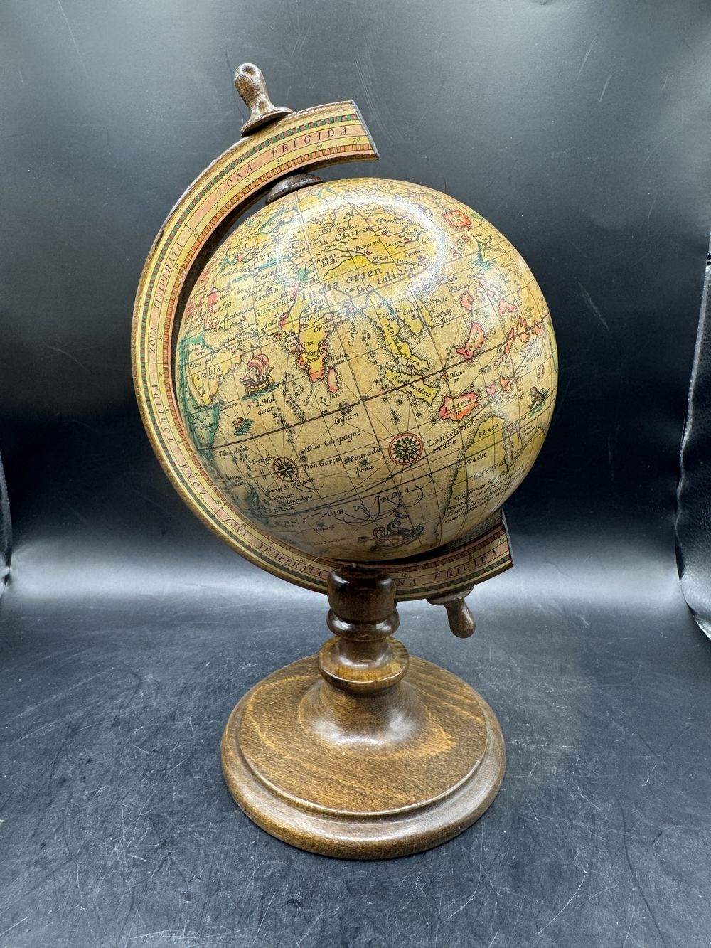 Sur socle bois, rotatif, revêtement papier verni, une décoration fidèle avec ses pays référencés en espagnol, sa rose des vents, les latitudes et longitudes et surtout ses monstres marins qui entretenaient les légendes !!