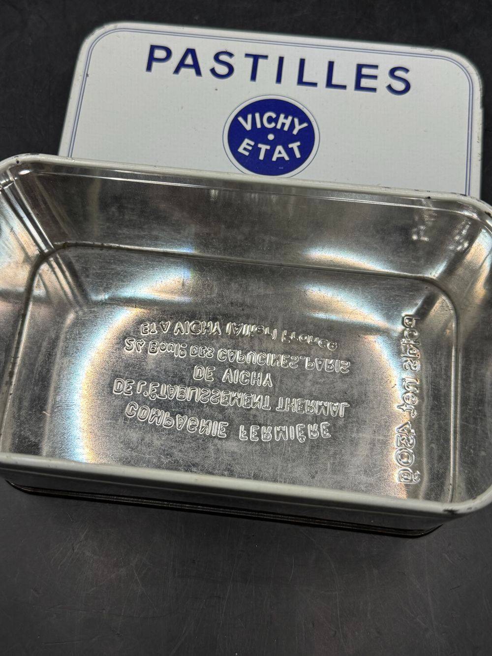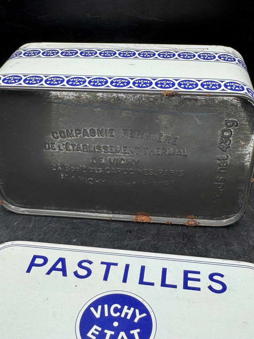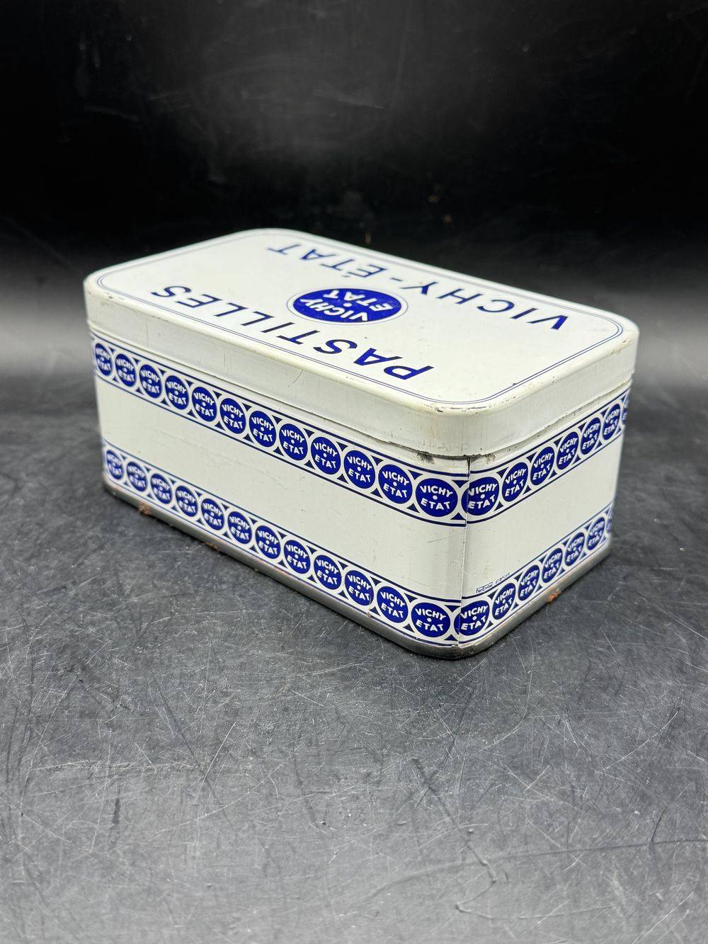 Petite et charmante boîte ancienne pastilles Vichy Etat – Blanche et bleue
