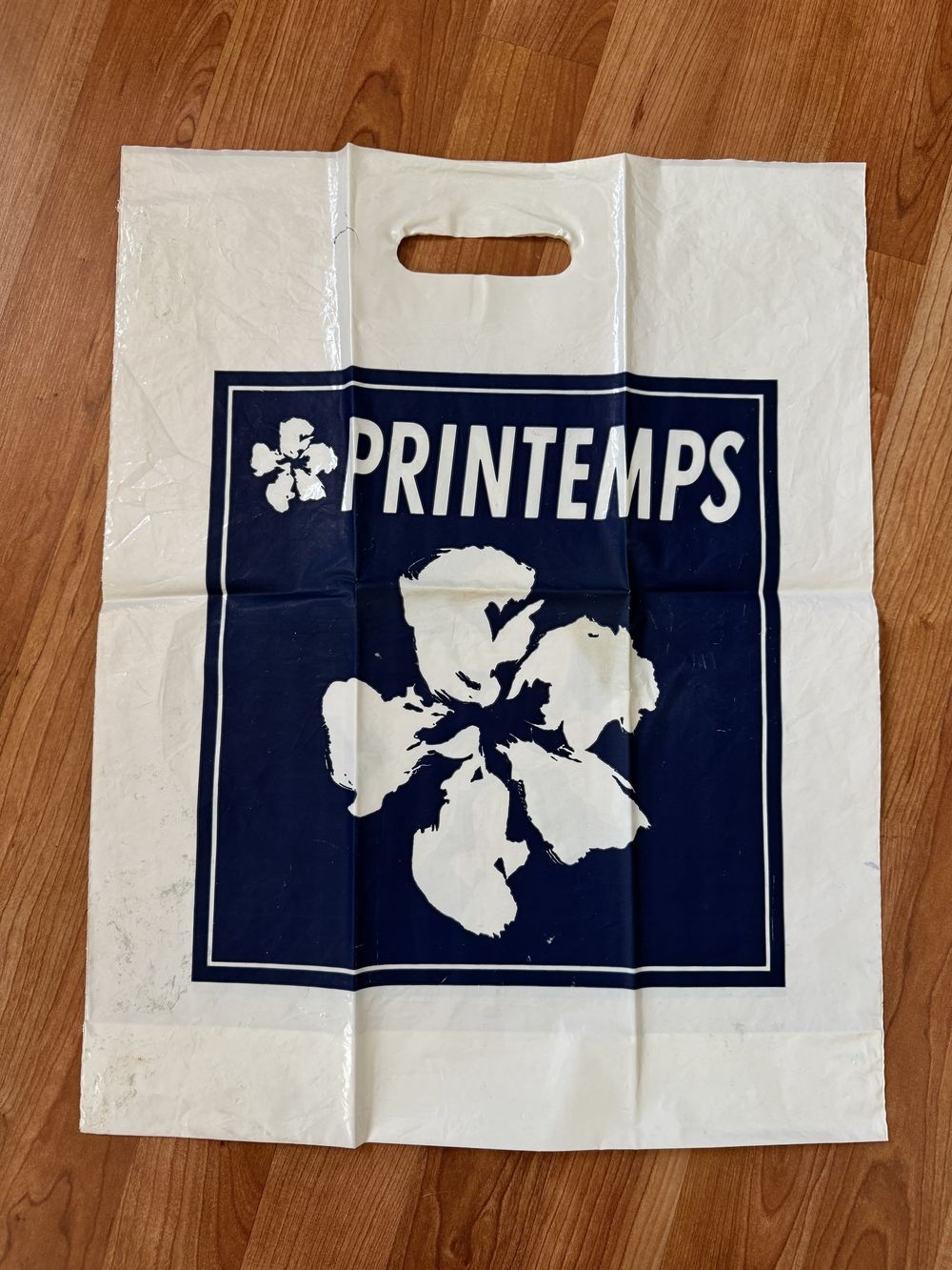 Rare ancien sac en plastique des années 80′ – Printemps – Blanc et bleu – Vintage – Collection – Décoration