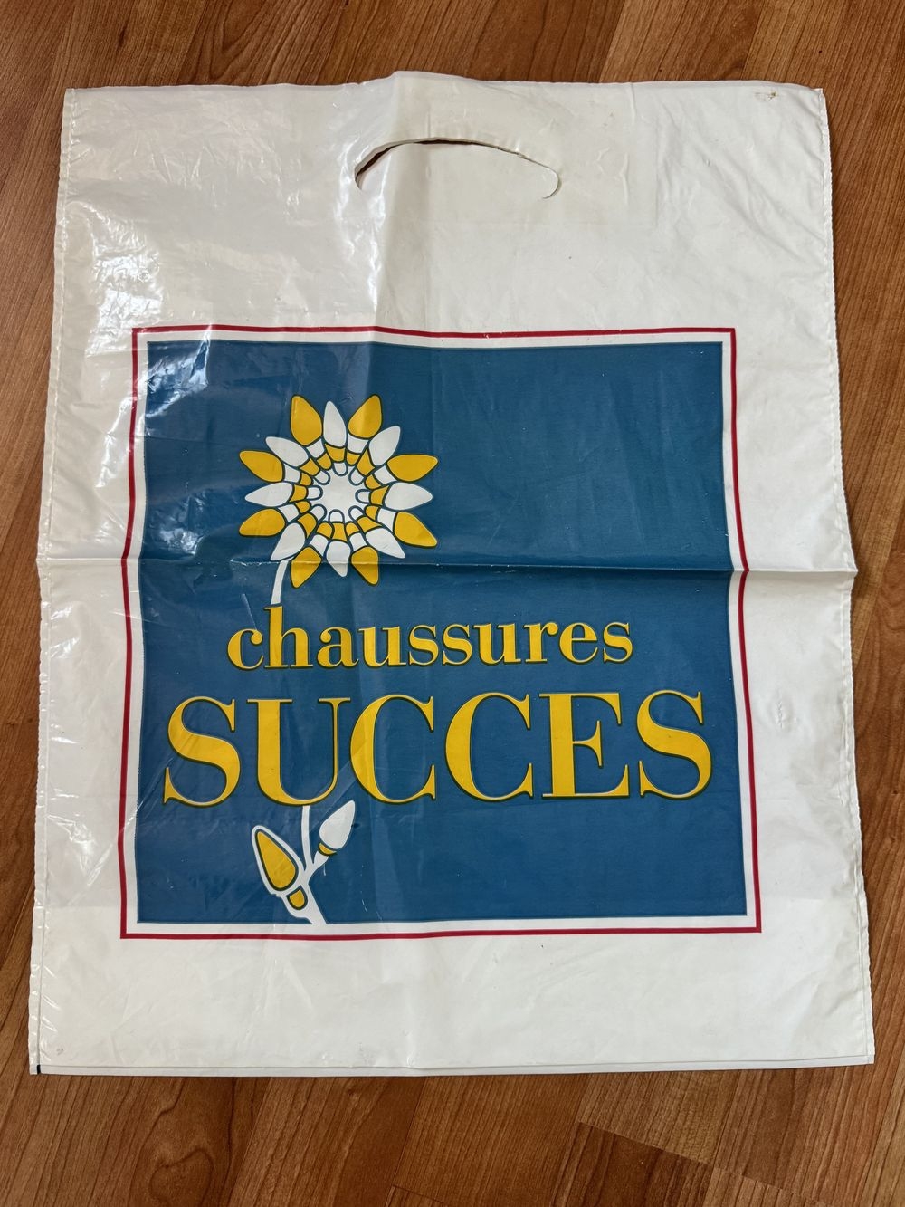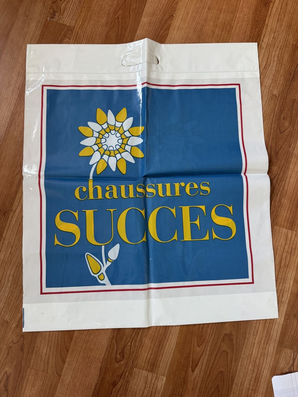 Rares deux anciens sacs en plastique des années 80′ – Chaussures Succès – Bleu et jaune – Vintage – Collection – Décoration
