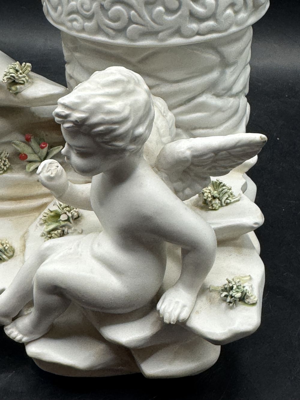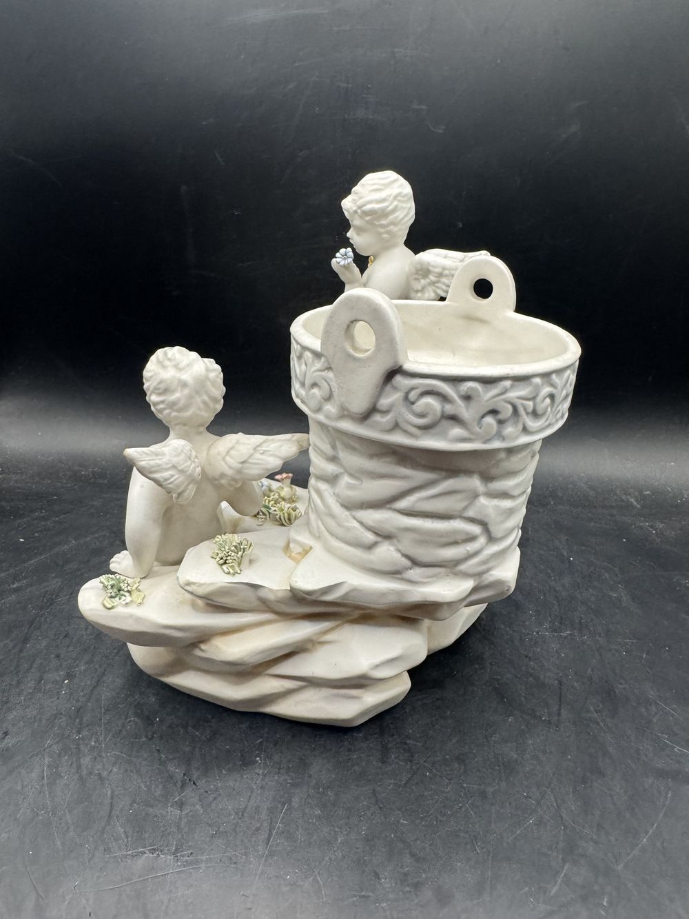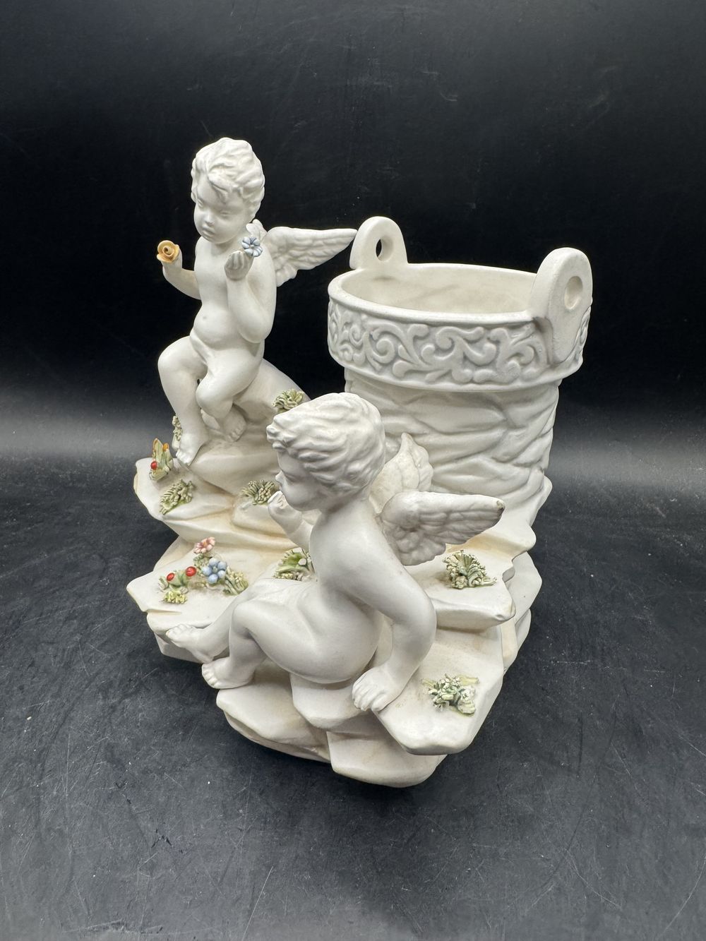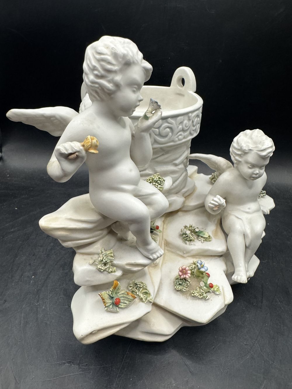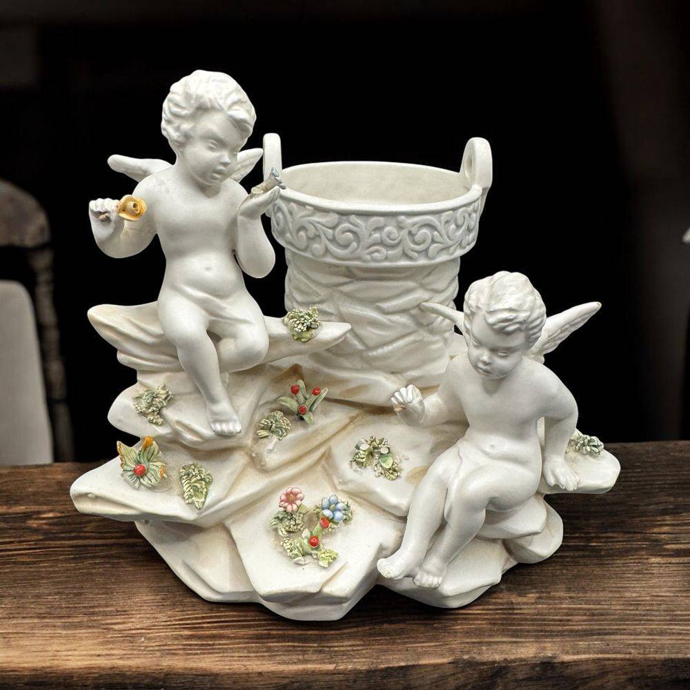 Rare et ancienne statuette en biscuit de porcelaine blanche – Italie – Deux angelots admirant des fleurs