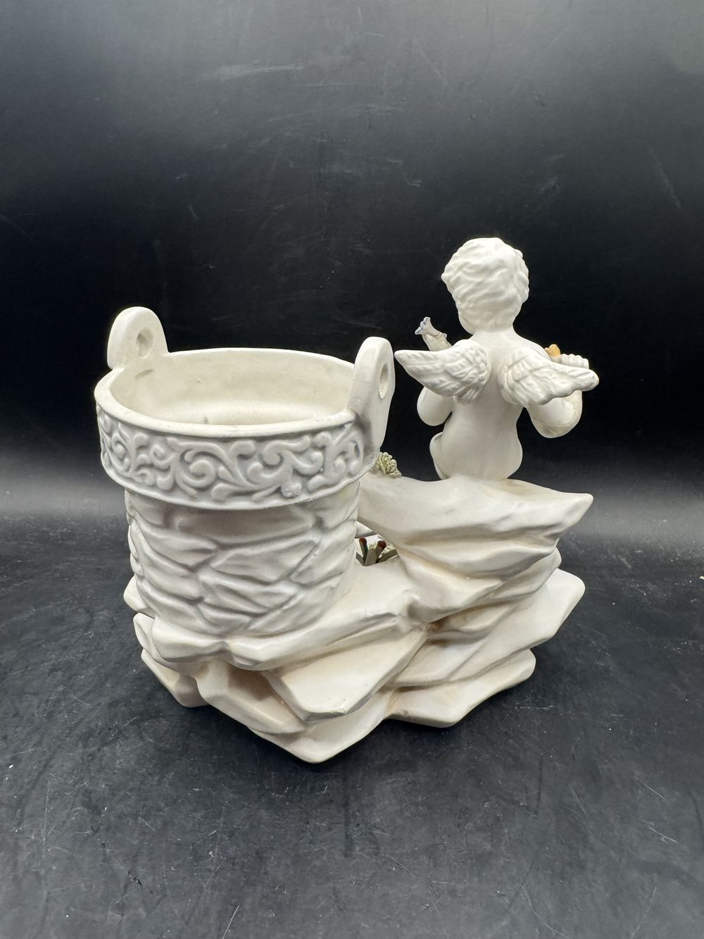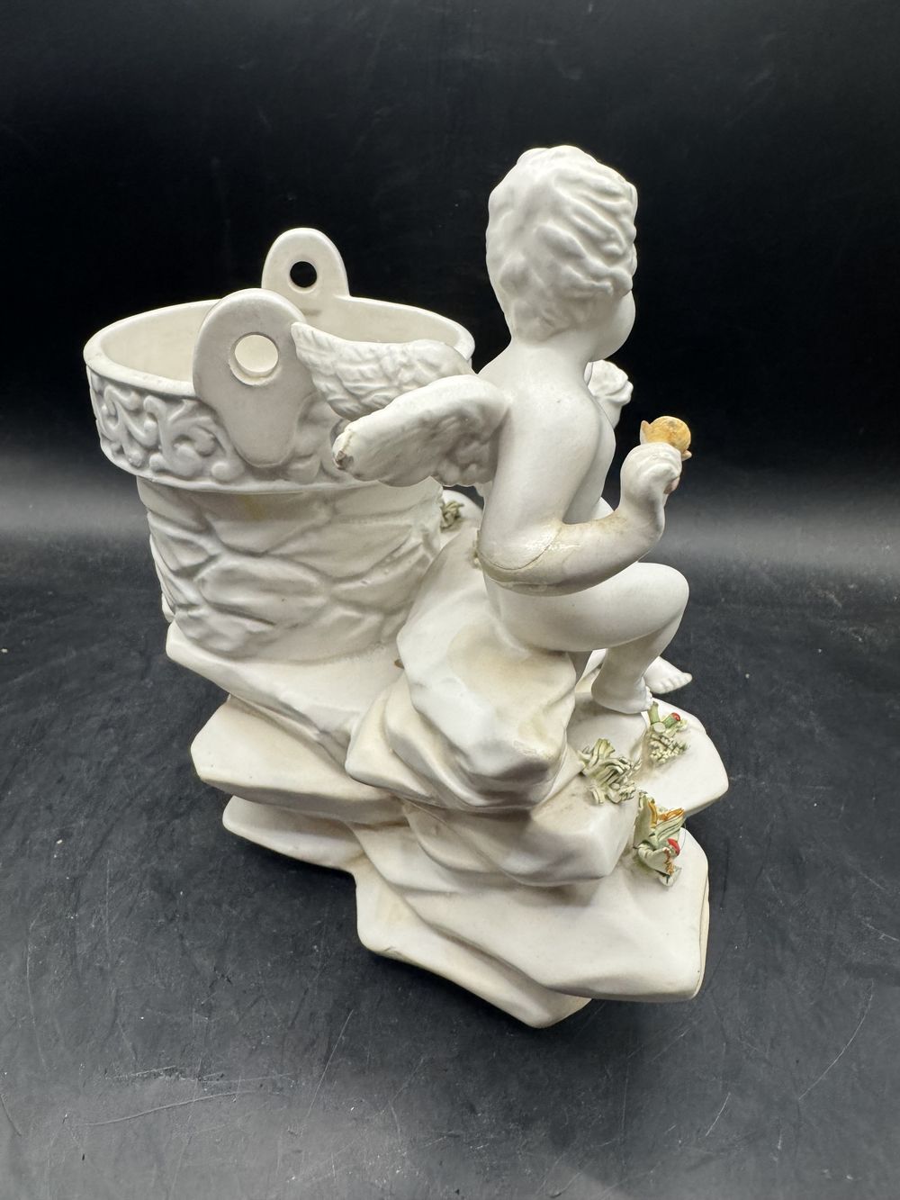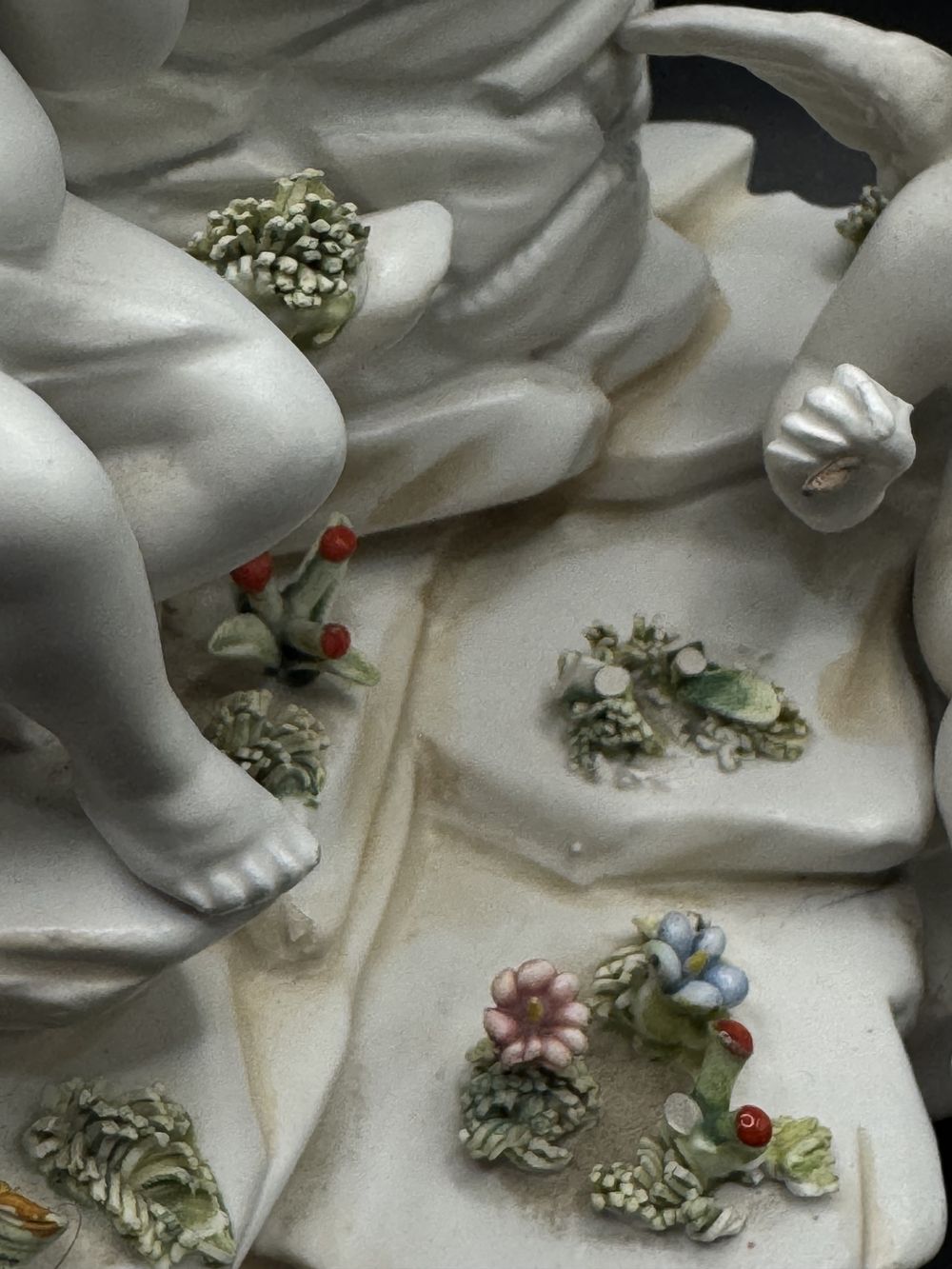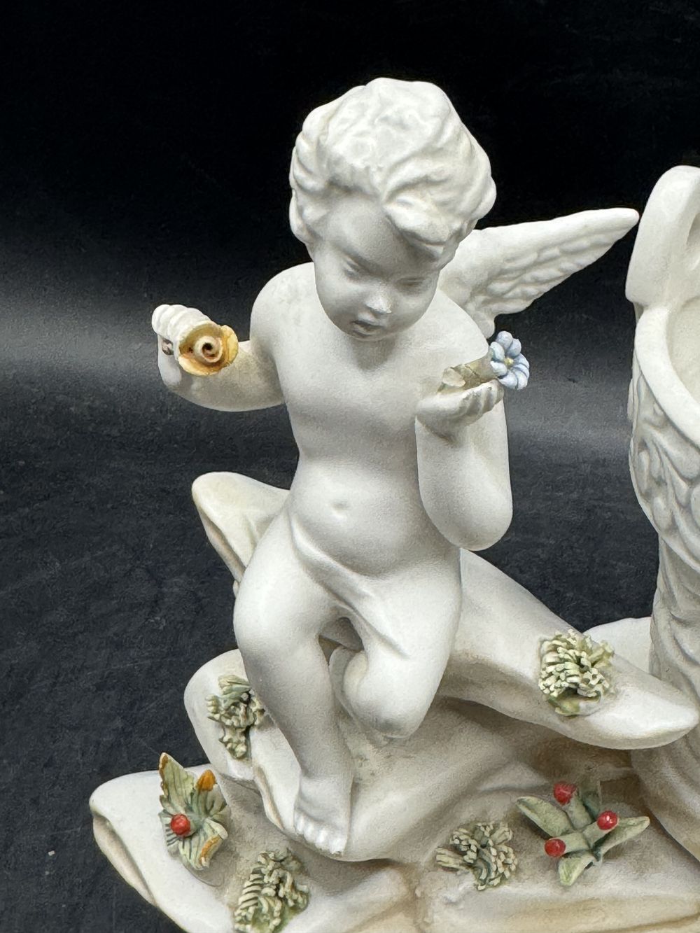 Rare et ancienne statuette en biscuit de porcelaine blanche – Italie – Deux angelots admirant des fleurs