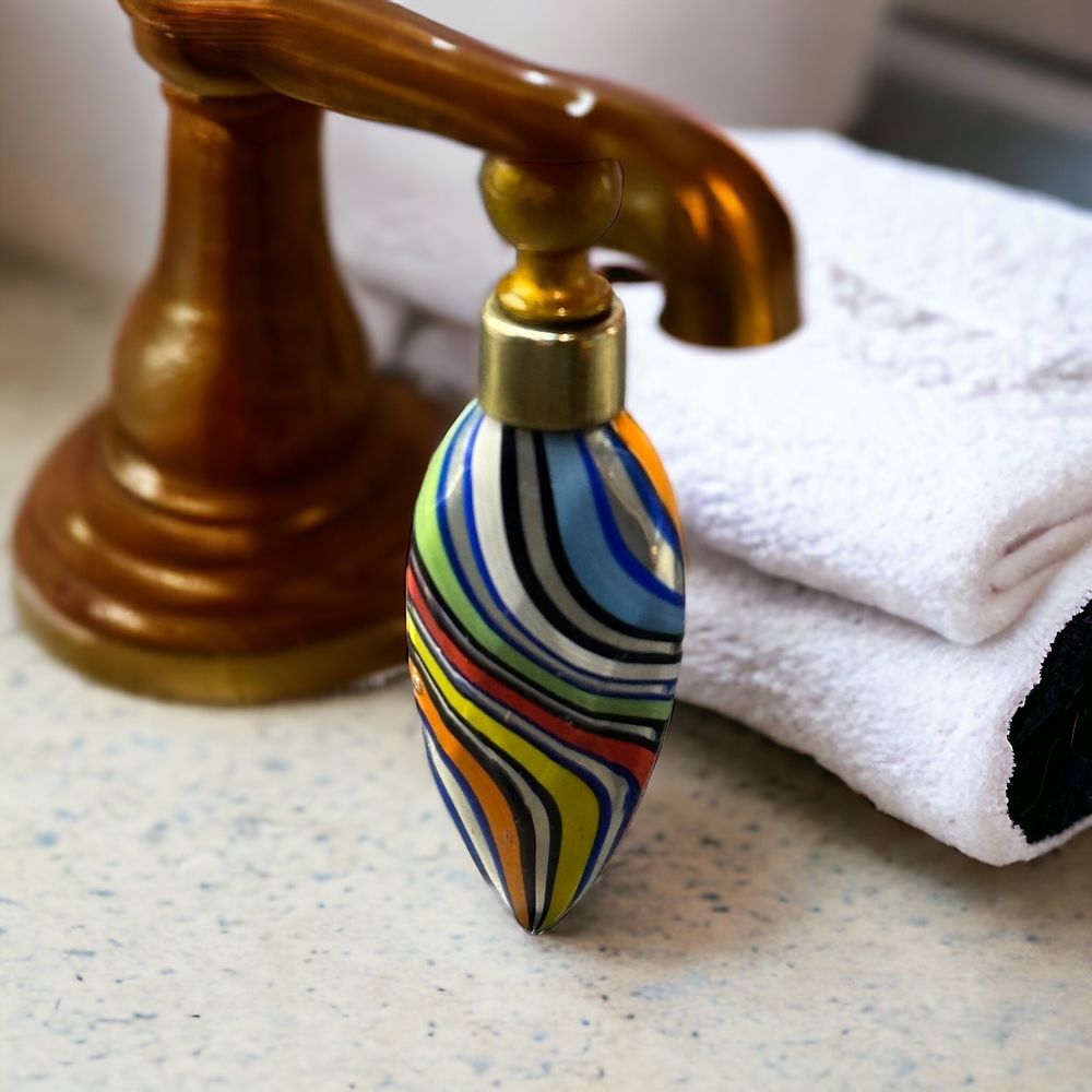 Il s’agit d’une bouteille soufflée à la main qui présente des rayures incurvées en jaune, orange, bleu et or. Cela est dû à l’inclusion de verre aventurine.