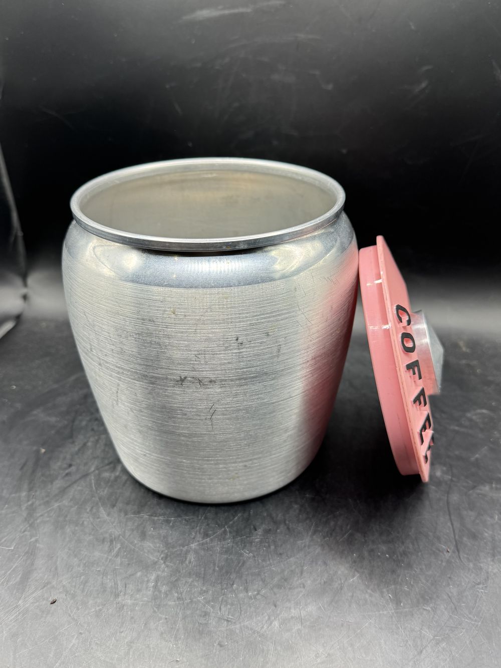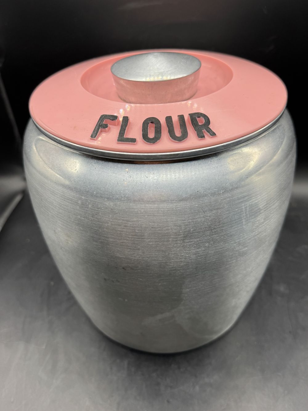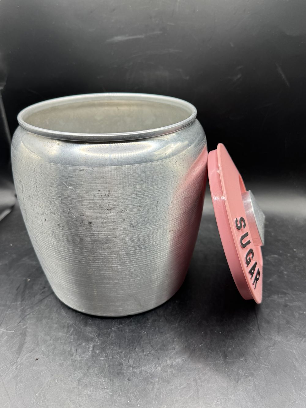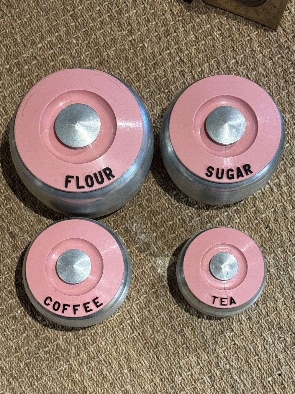 Rare et introuvable lot de 4 bidons/pots en Aluminium brossé – Kromex – 1950 – Usa – Avec leurs couvercles roses : Farine/Flour, Café/Coffee, Sucre/Sugar, Thé/Tea – Collection – Décoration