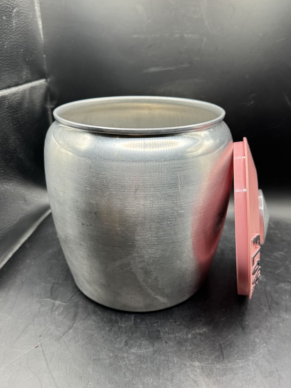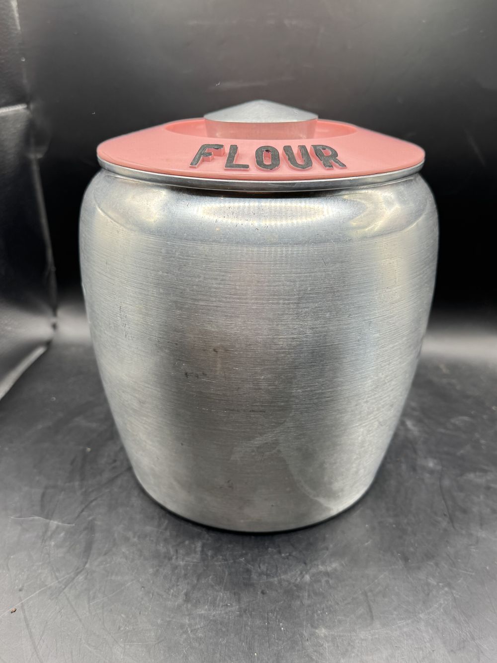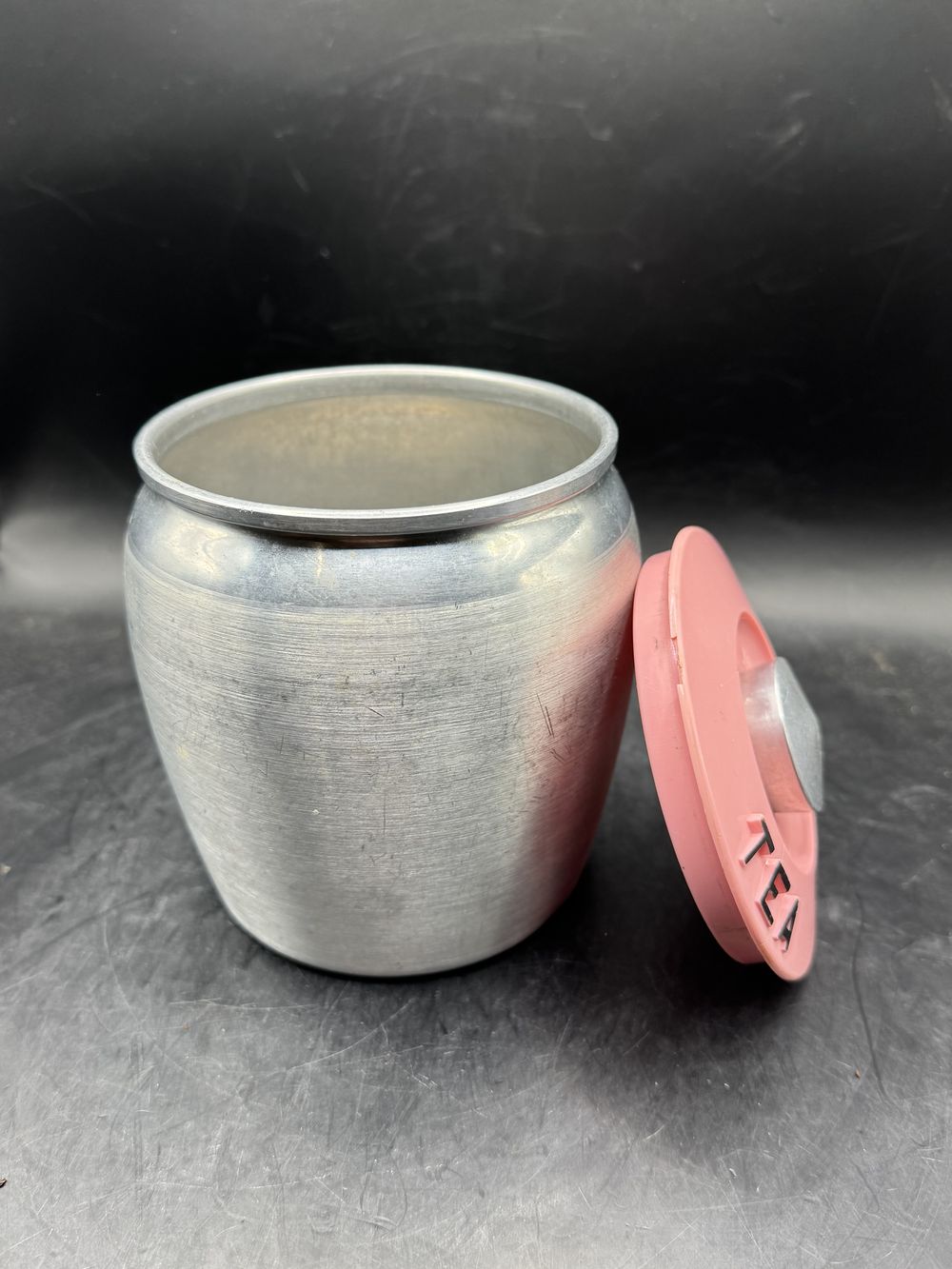 Rare et introuvable lot de 4 bidons/pots en Aluminium brossé – Kromex – 1950 – Usa – Avec leurs couvercles roses : Farine/Flour, Café/Coffee, Sucre/Sugar, Thé/Tea – Collection – Décoration