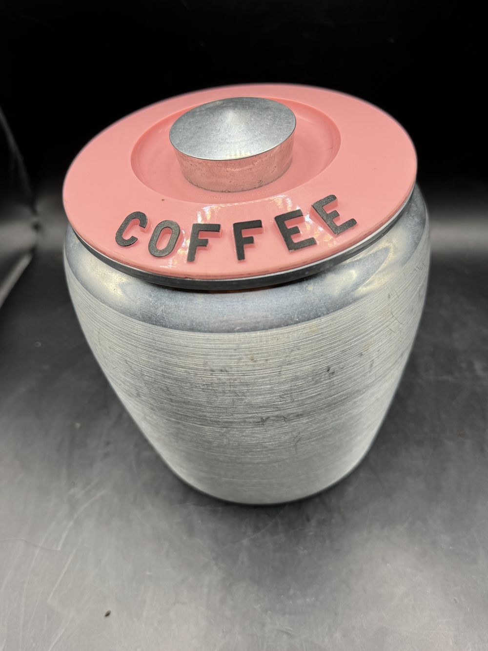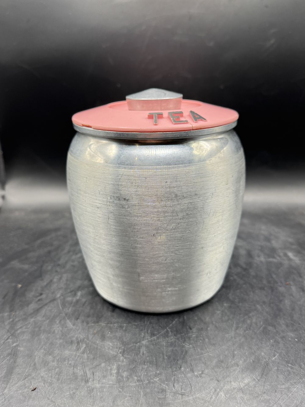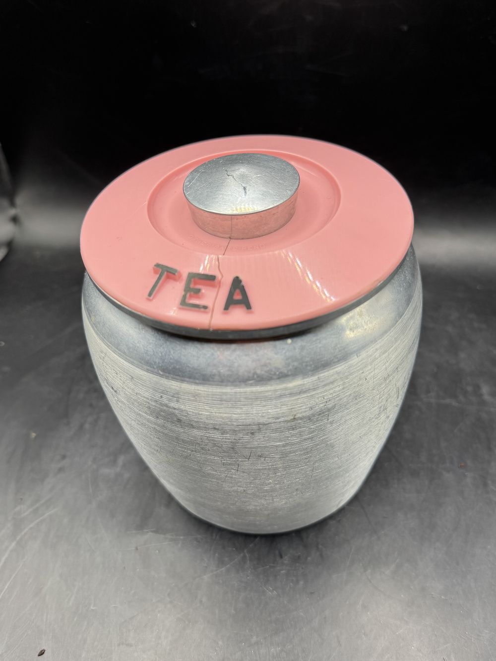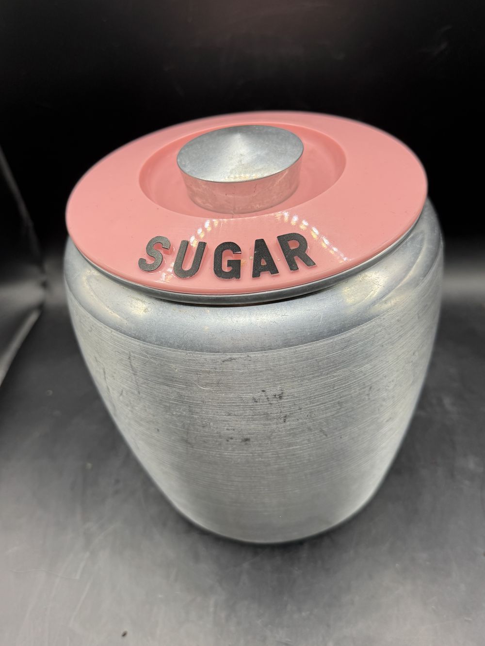 Rare et introuvable lot de 4 bidons/pots en Aluminium brossé – Kromex – 1950 – Usa – Avec leurs couvercles roses : Farine/Flour, Café/Coffee, Sucre/Sugar, Thé/Tea – Collection – Décoration