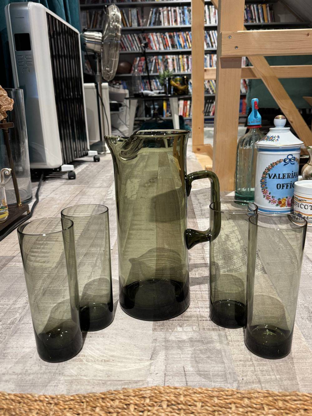 Rare et Magnifique Set / Service à Orangeade – 5 pièces – En verre fumé des années 70 – Collection – Déco bar – Bistrot – Café – Vintage