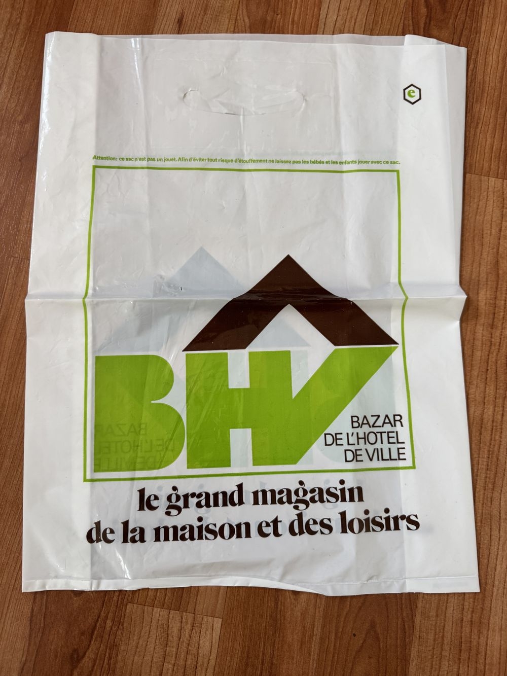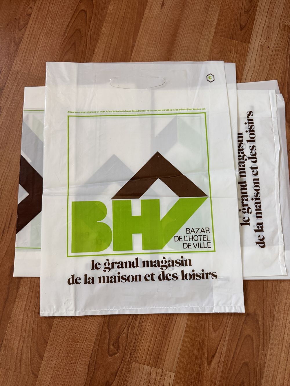 Rare lot d’anciens sacs (3) en plastique des années 80′ – Bhv – Paris – Blanc logo vert et marron – Vintage – Collection – Décoration