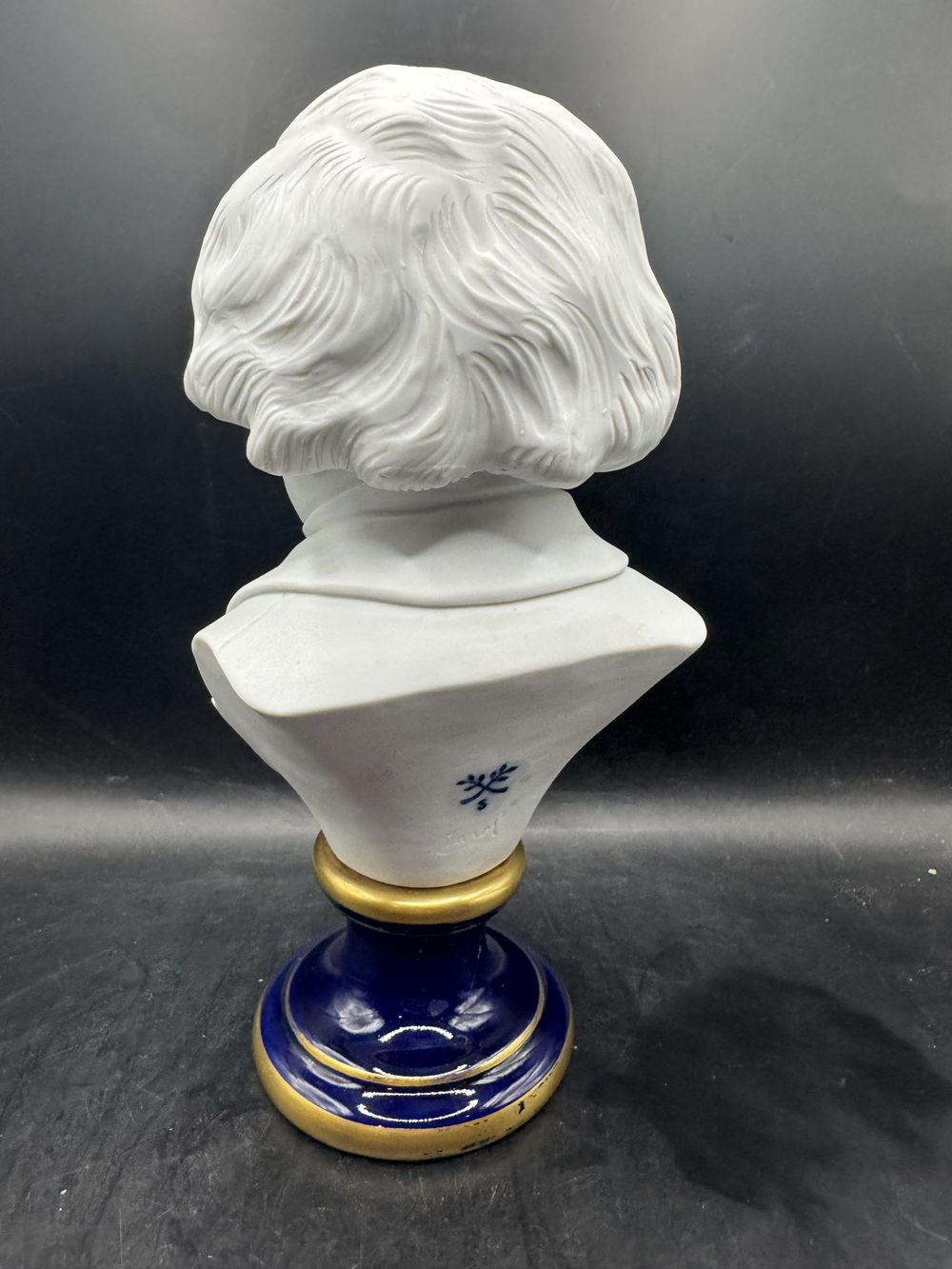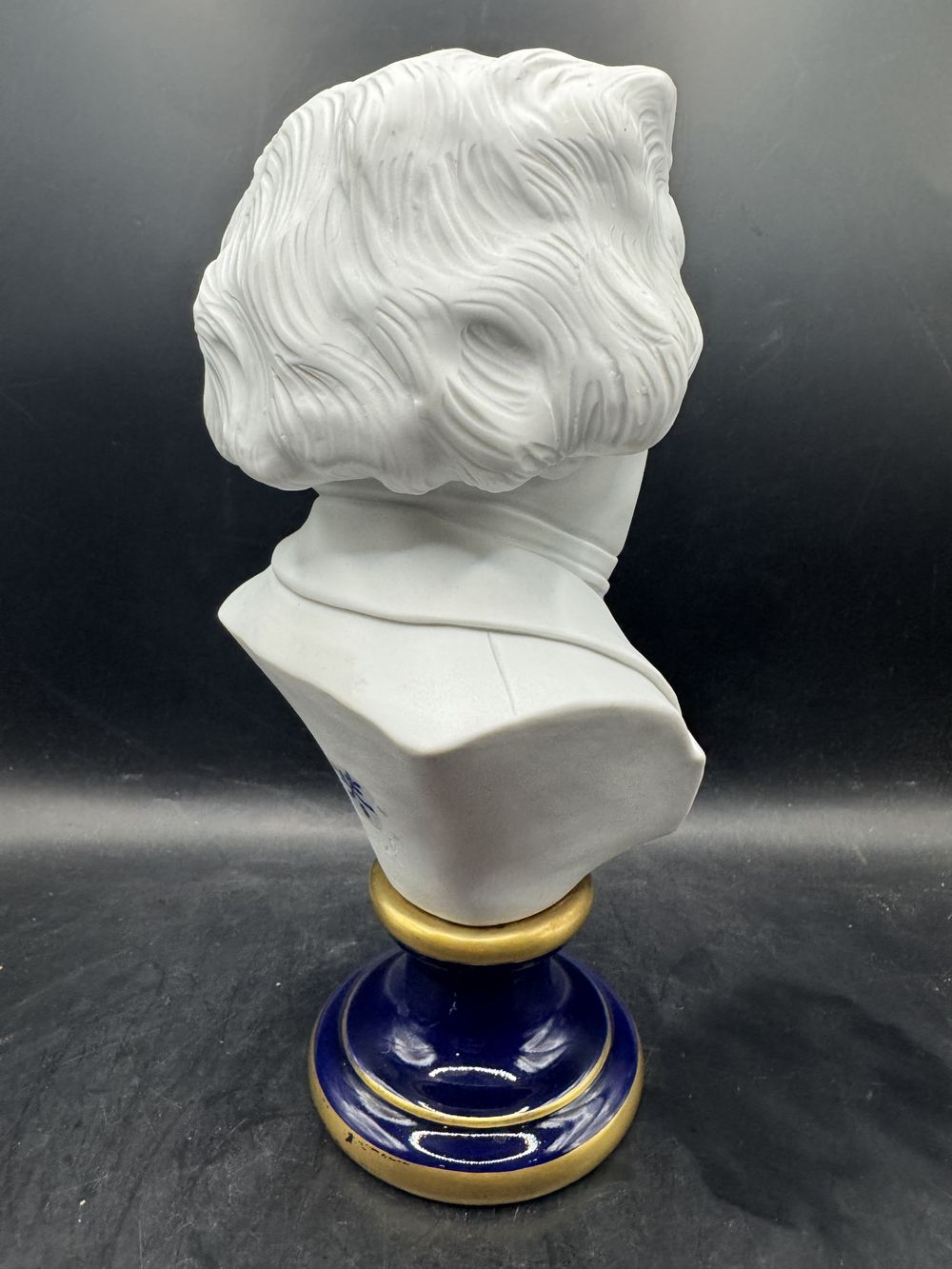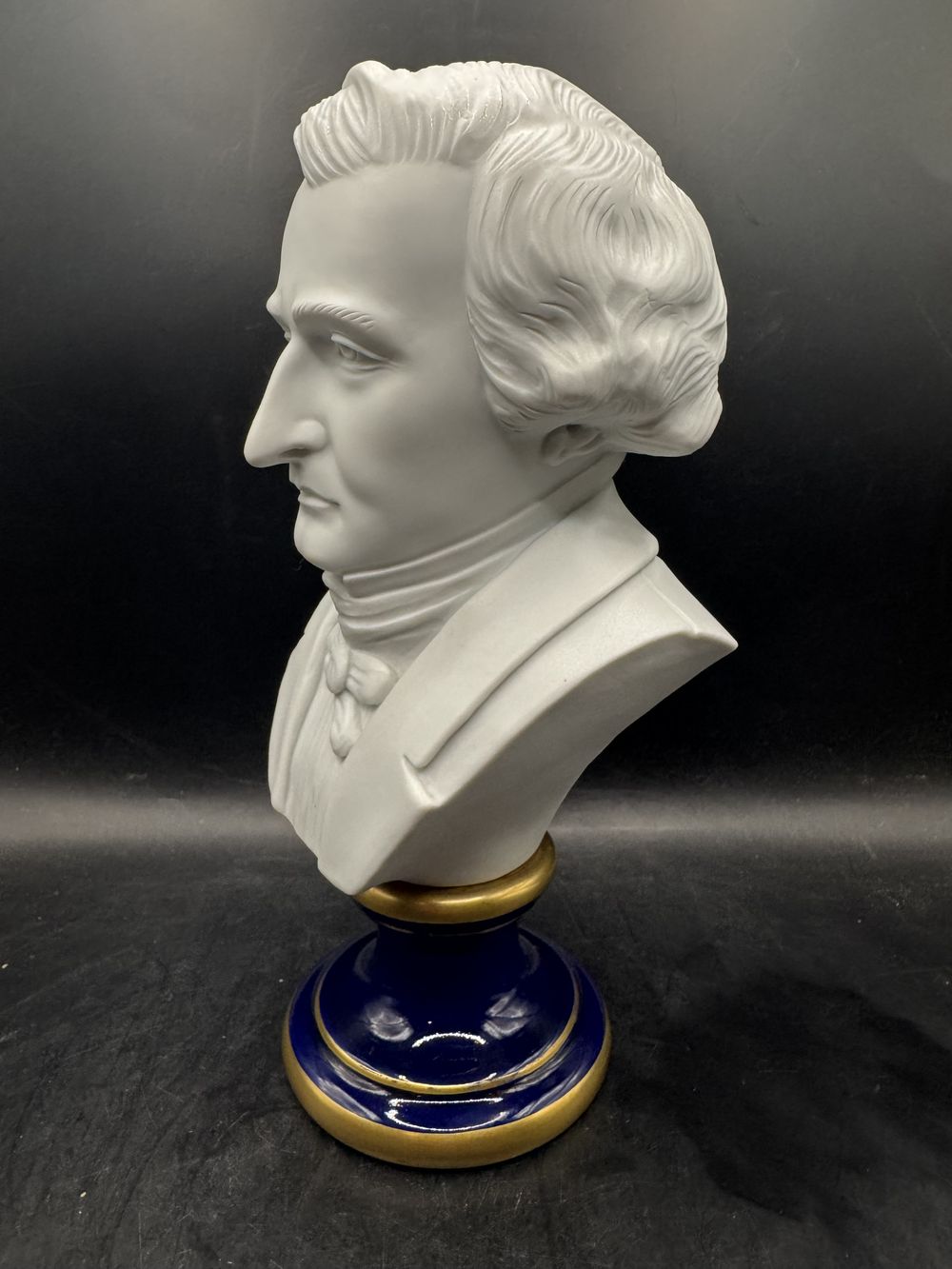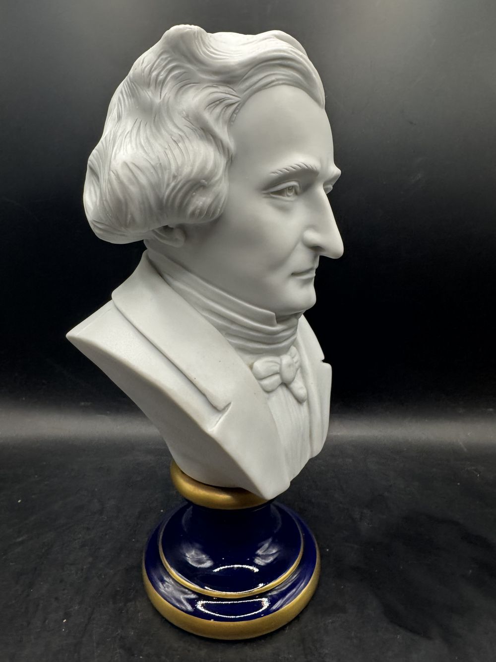 Rare Statuette/buste ancien en biscuit de porcelaine représentant Frédéric Chopin – Sur piédouche en porcelaine bleu