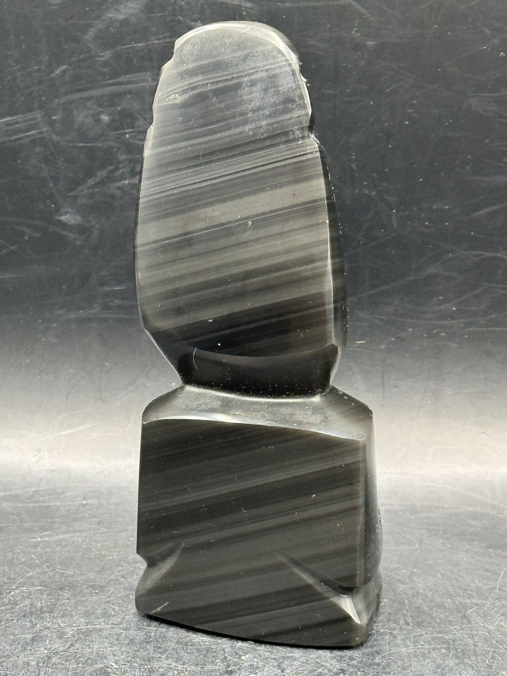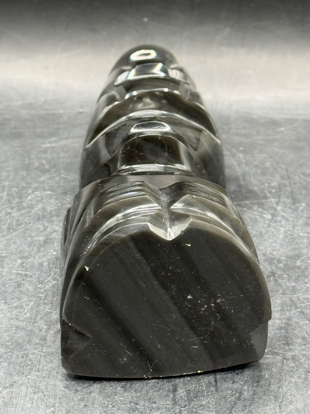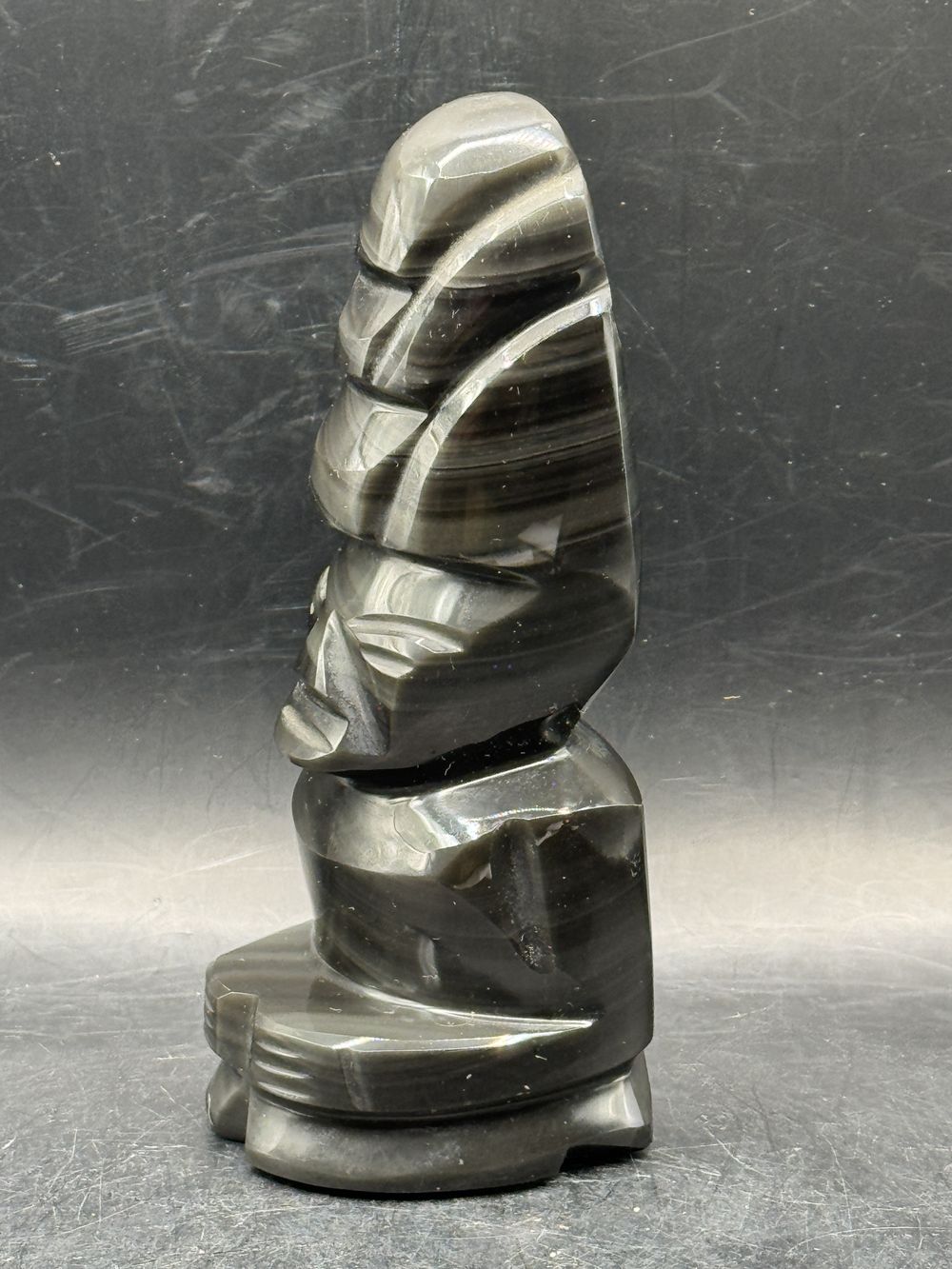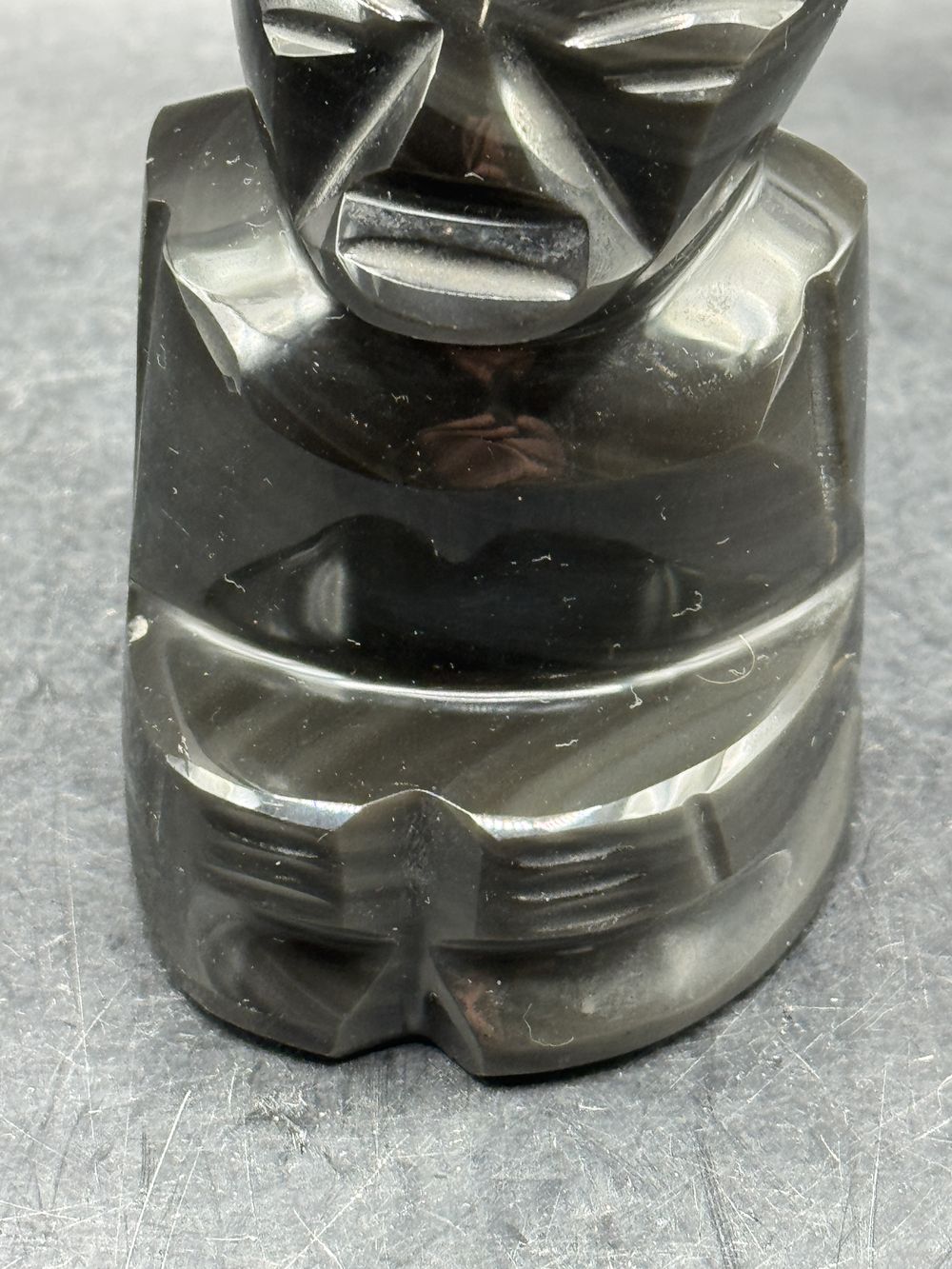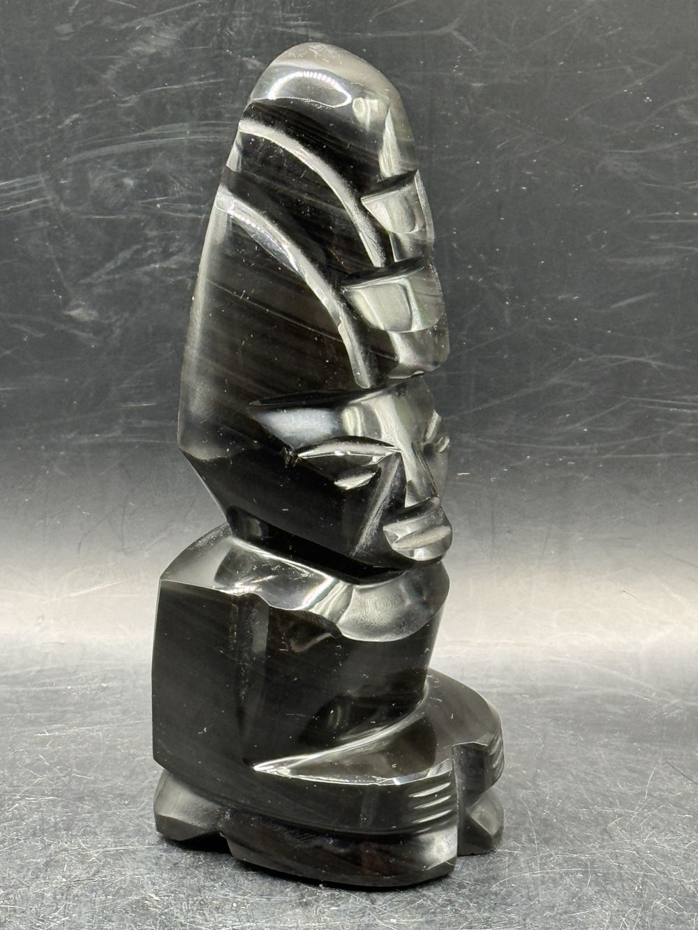 Statuette Guerrier/Totem Aztèque/Maya en pierre d’Obsidienne noire brute avec grande coiffe typique – Origine/Mexique – Vers 1970 – Collection – Décoration – Vintage