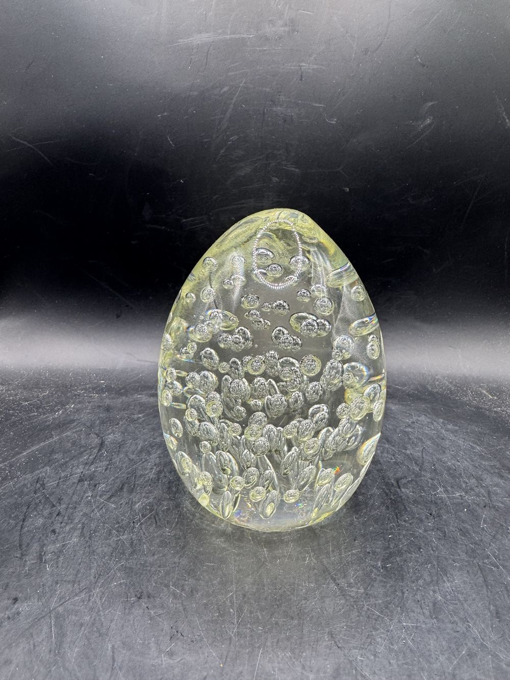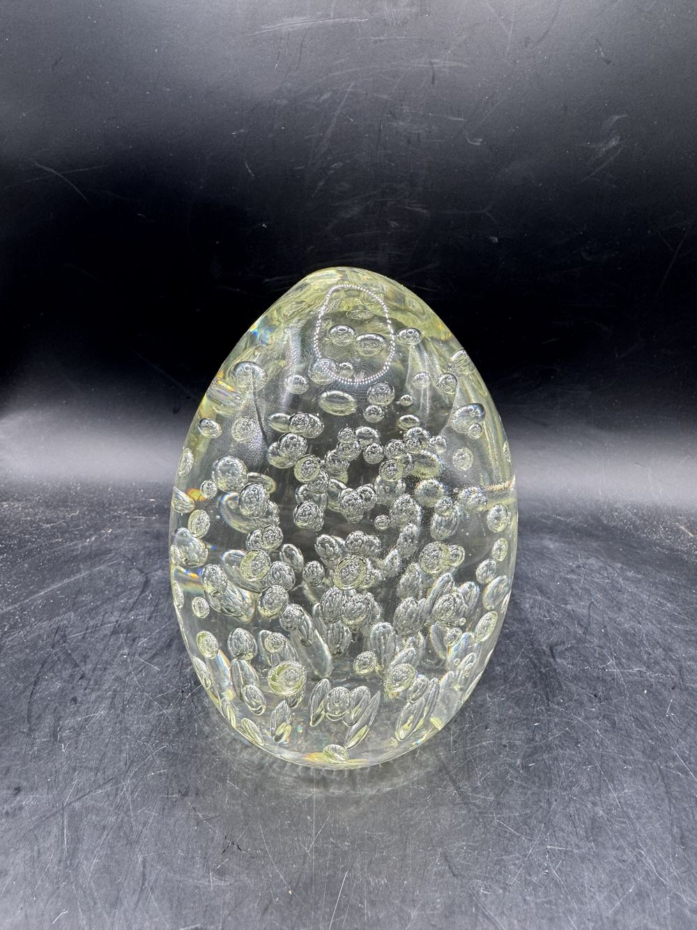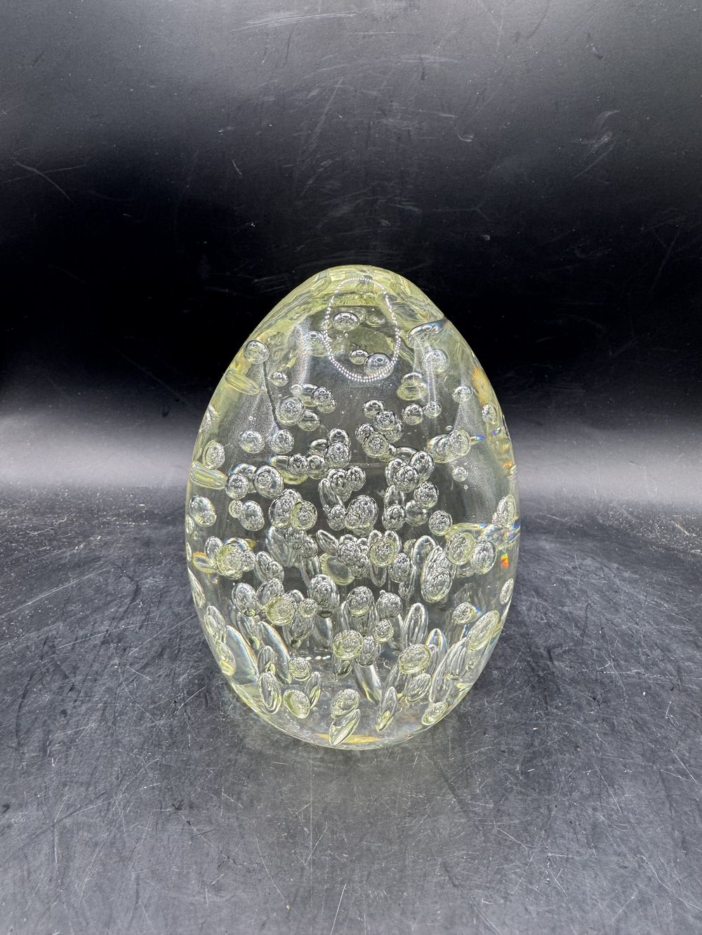 Sulfure imposante (Presse papier en verre) en forme d’œuf avec des bulles – De couleur jaune pâle – Déco – Collection – Diamètre ~9 cm