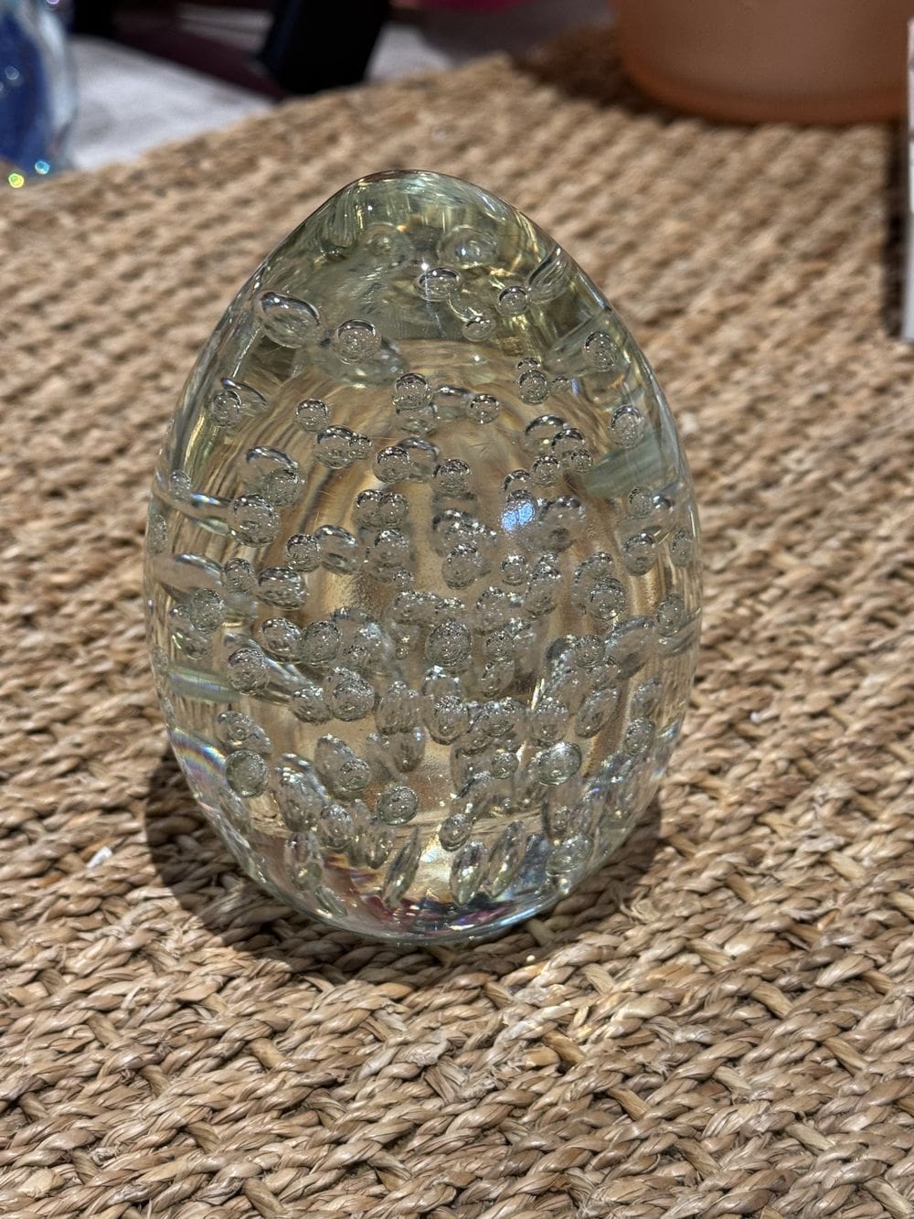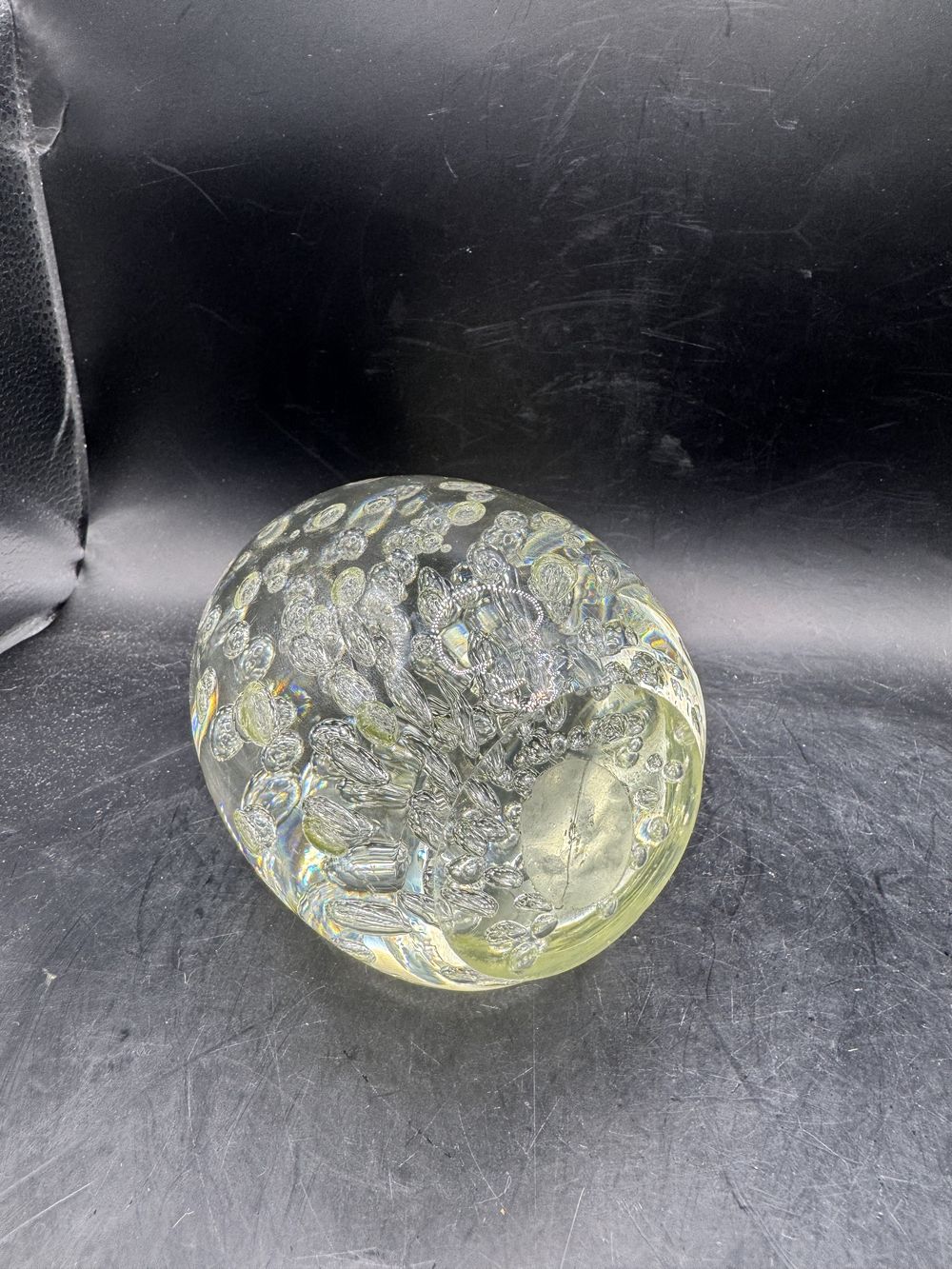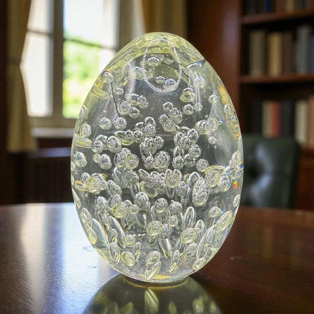 Sulfure imposante (Presse papier en verre) en forme d’œuf avec des bulles – De couleur jaune pâle – Déco – Collection – Diamètre ~9 cm