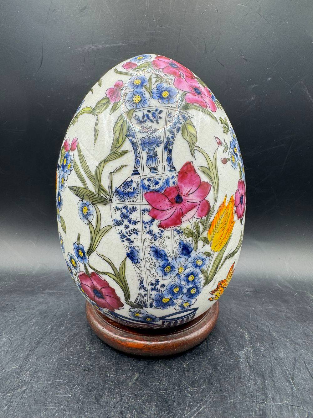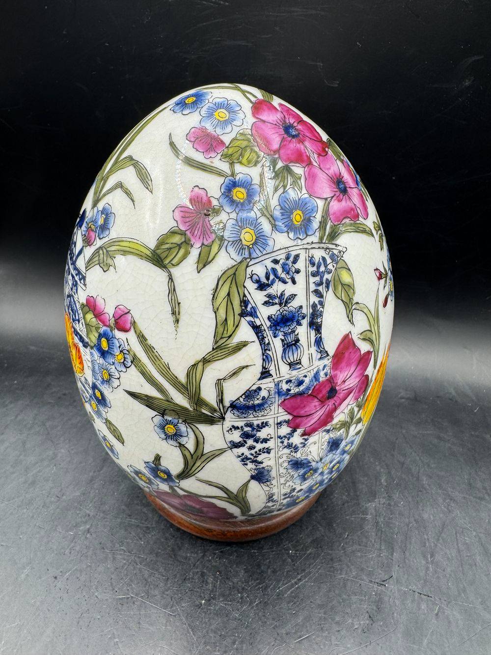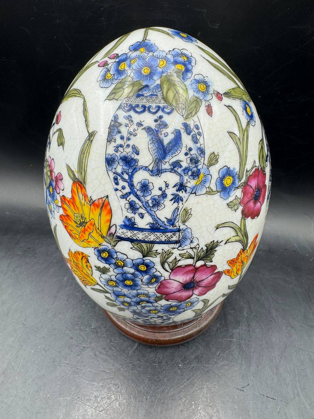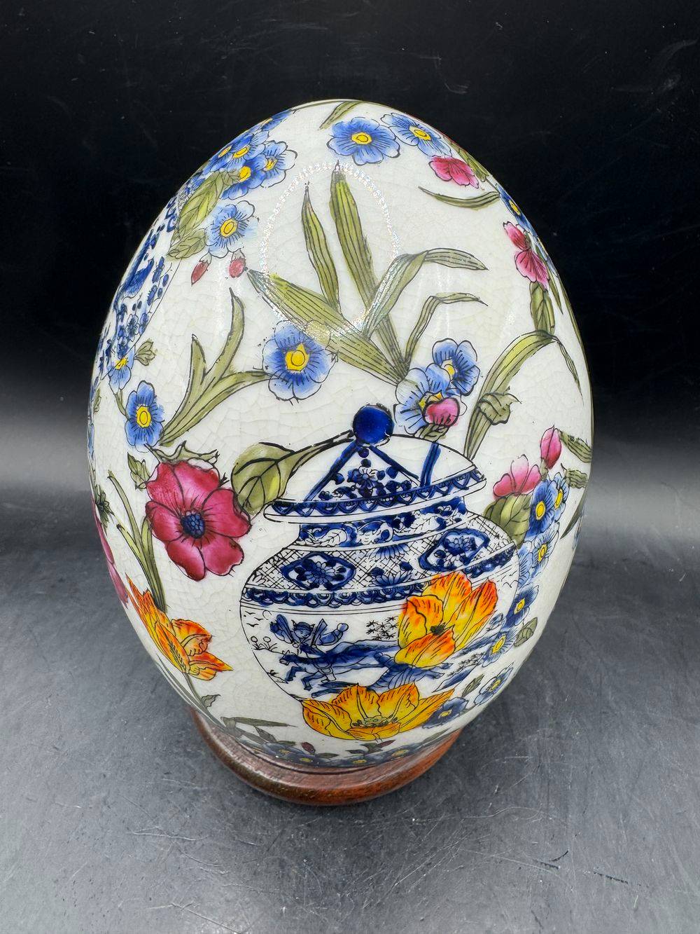 Superbe œuf décoratif en porcelaine craquelée sur son socle – Richement peint à la main dans un style Asiatique traditionnel – Vers 1950/60 – Décor floral – Collection – Décoration