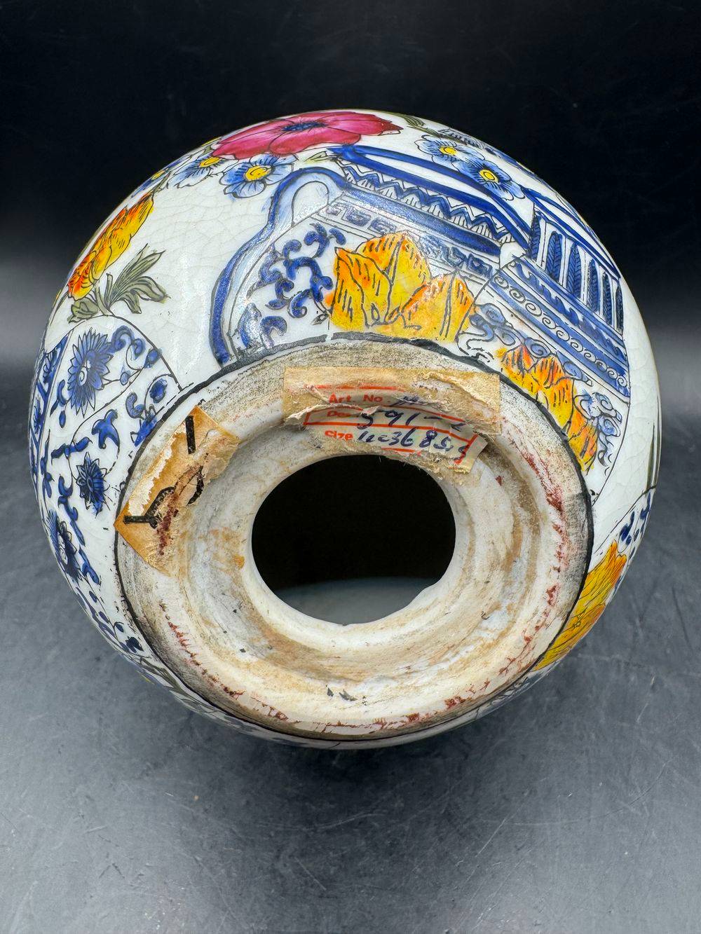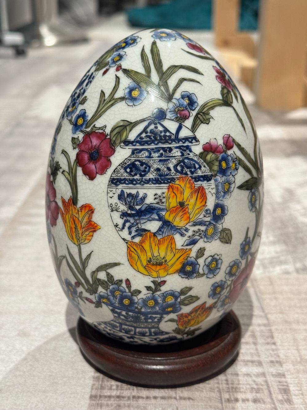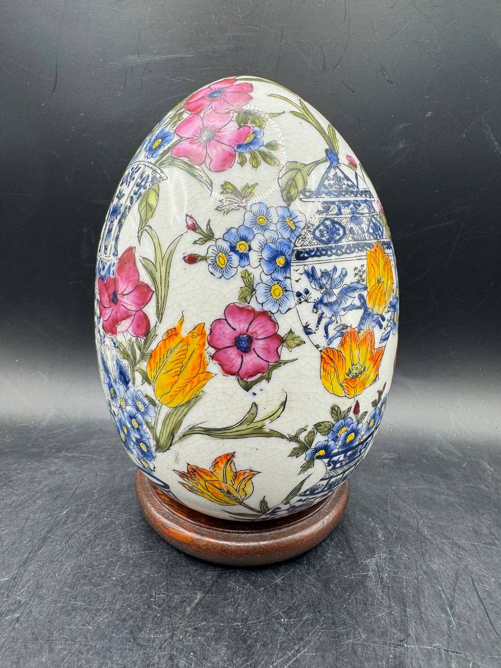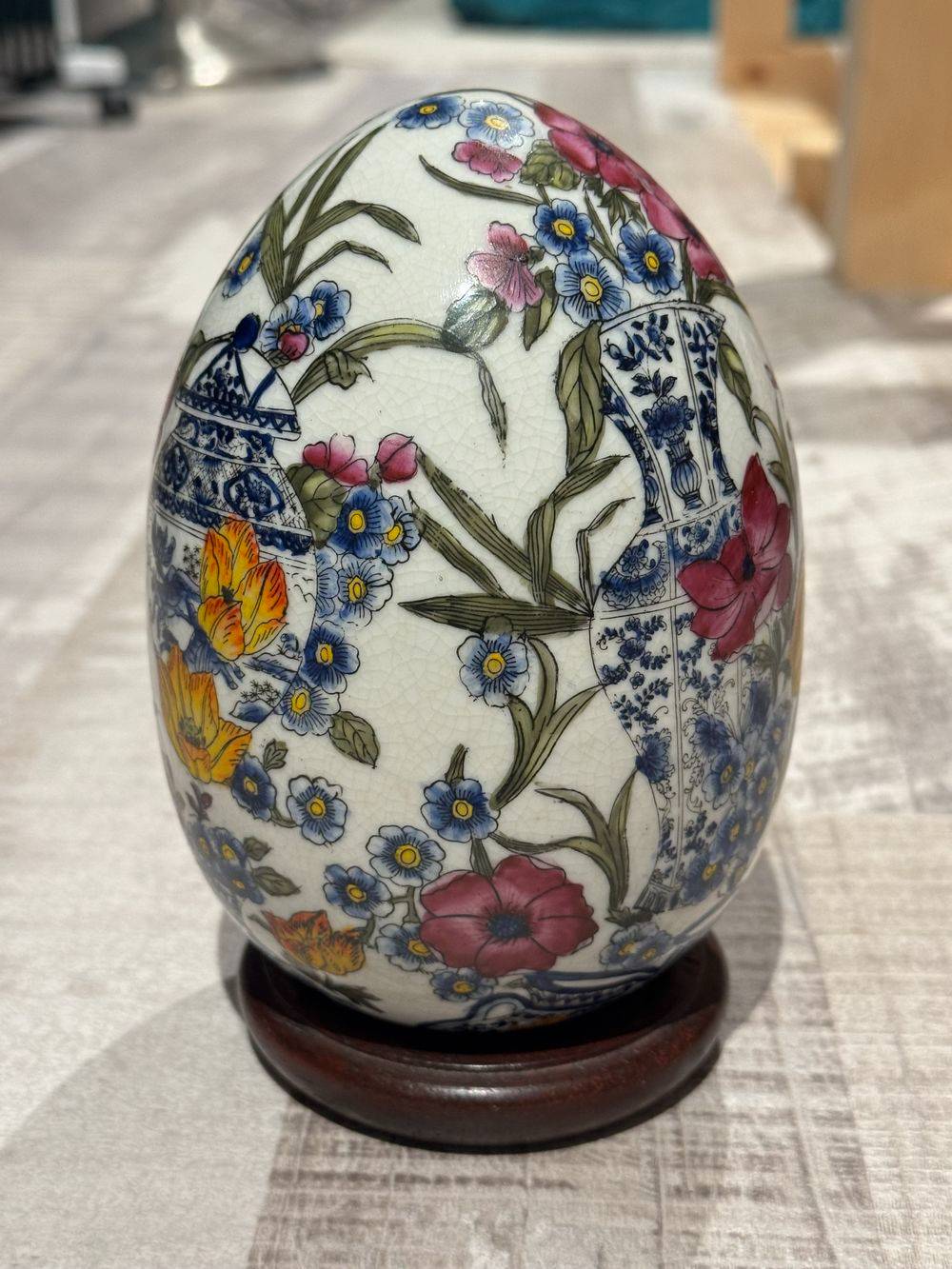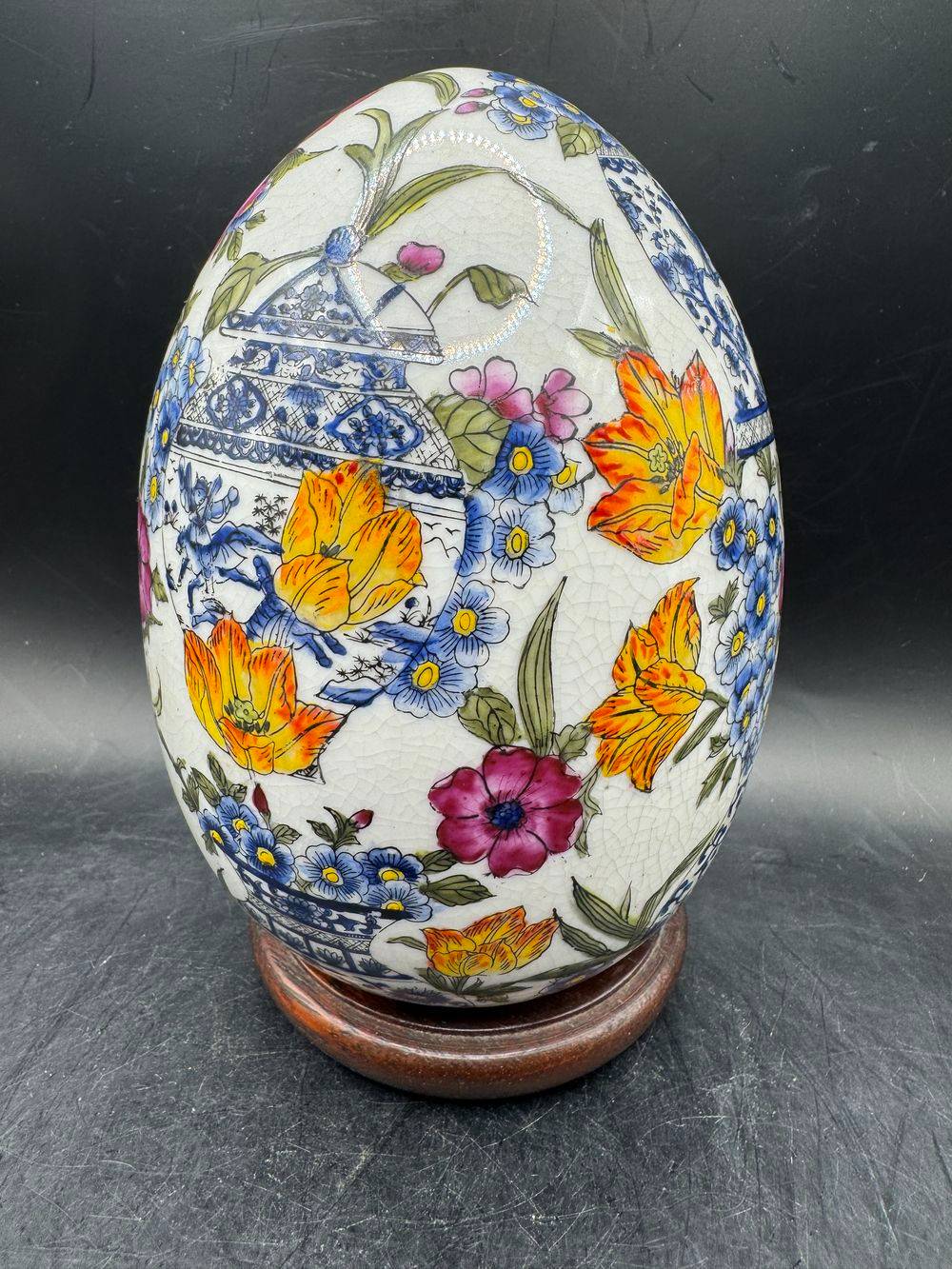 Superbe œuf décoratif en porcelaine craquelée sur son socle – Richement peint à la main dans un style Asiatique traditionnel – Vers 1950/60 – Décor floral – Collection – Décoration