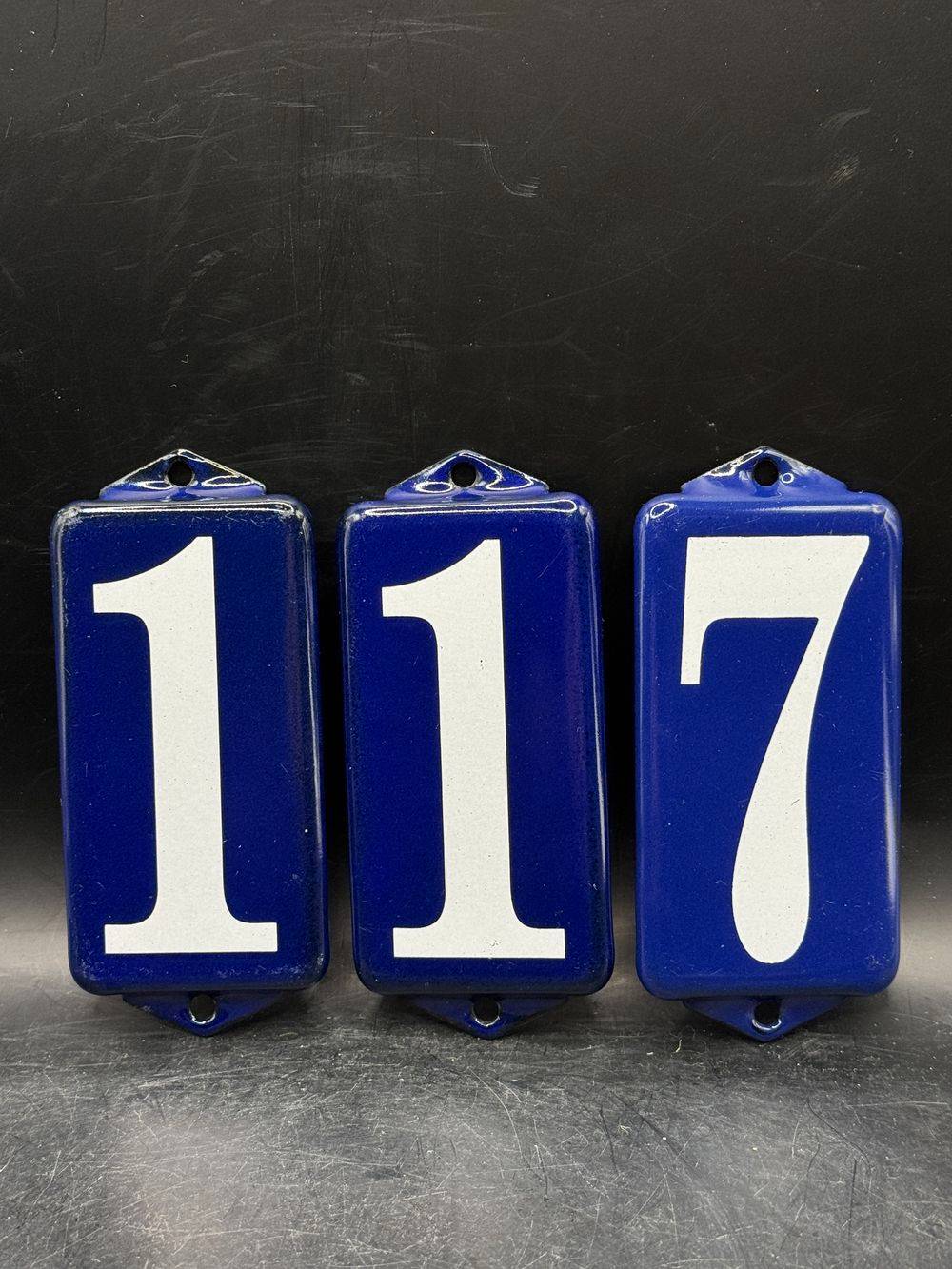 Trois petites plaques émaillées bleues et blanches avec les chiffres un (x2) et sept (7) – 117 – 171 …