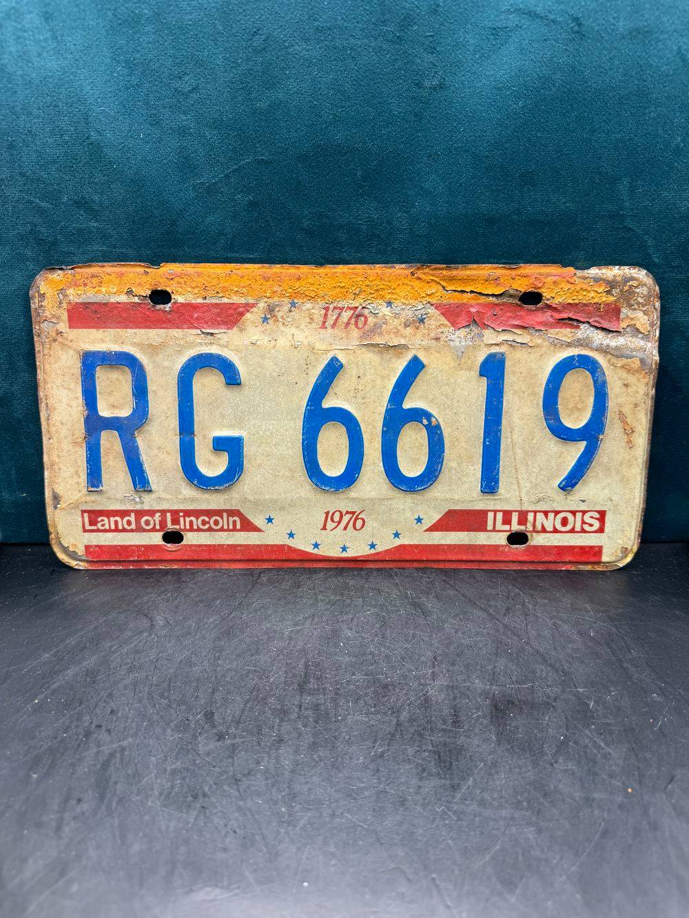 Vraie plaque originale d’immatriculation (en métal et relief) – Vintage des Usa – Etats-Unis – Etat de l’Illinois – 1976 – Blanche et rouge – Décoration murale pour garage – Collection