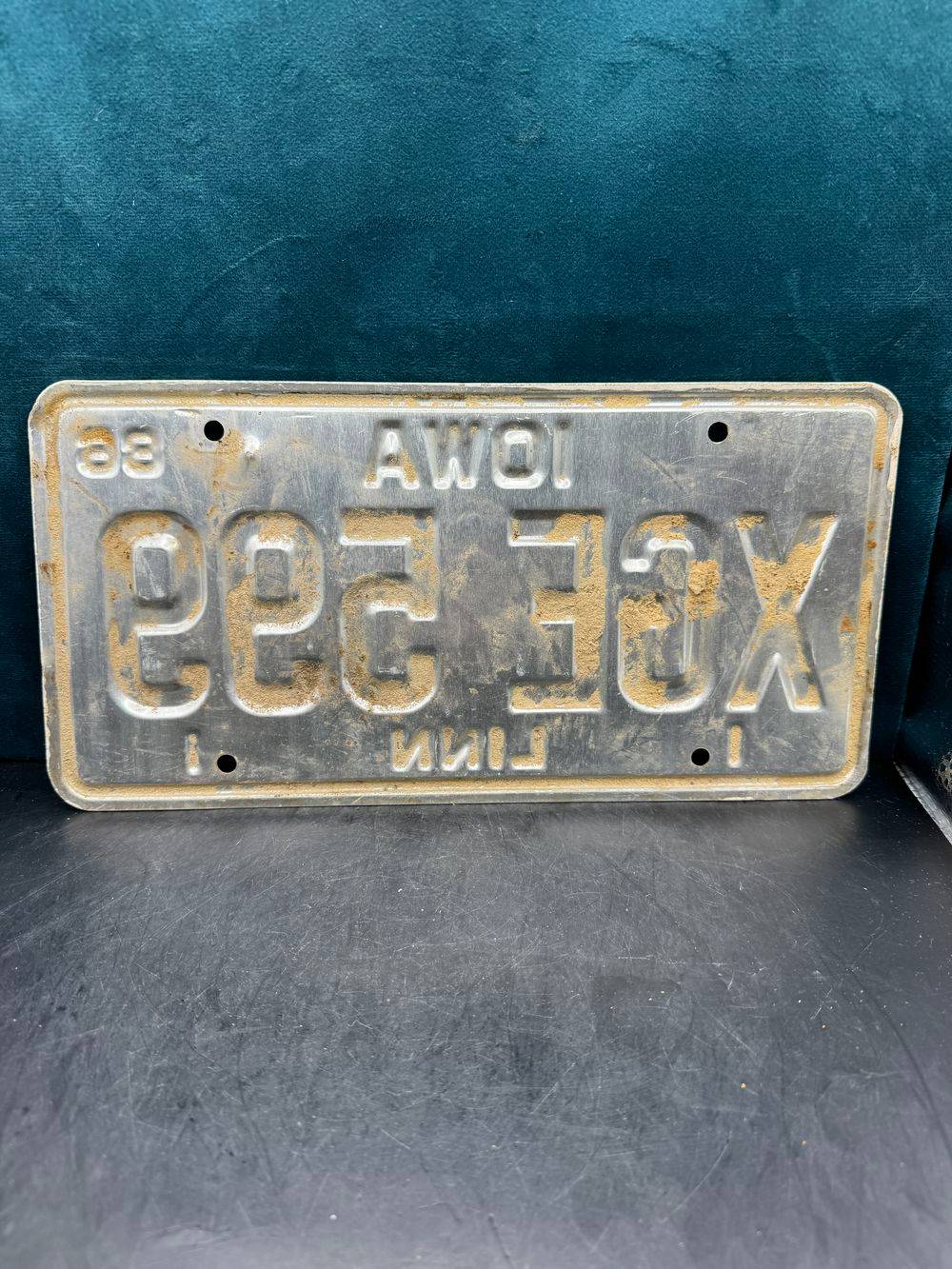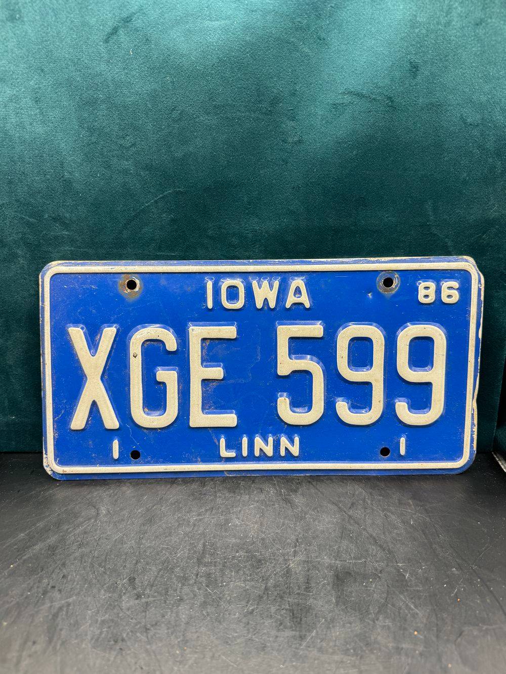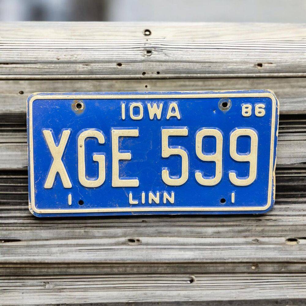 Vraie plaque originale d’immatriculation (en métal et relief) – Vintage des Usa – Etats-Unis – Etat de l’Iowa – 1986 – Bleue – Décoration murale pour garage – Collection